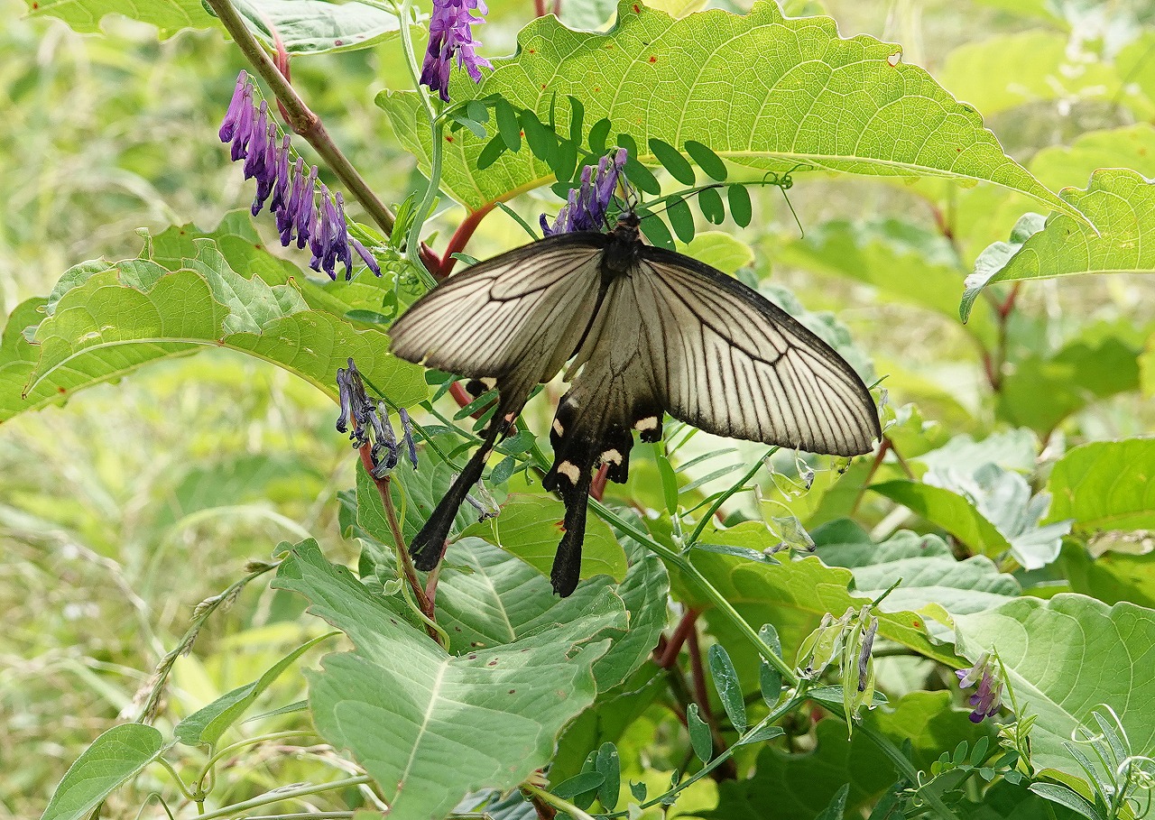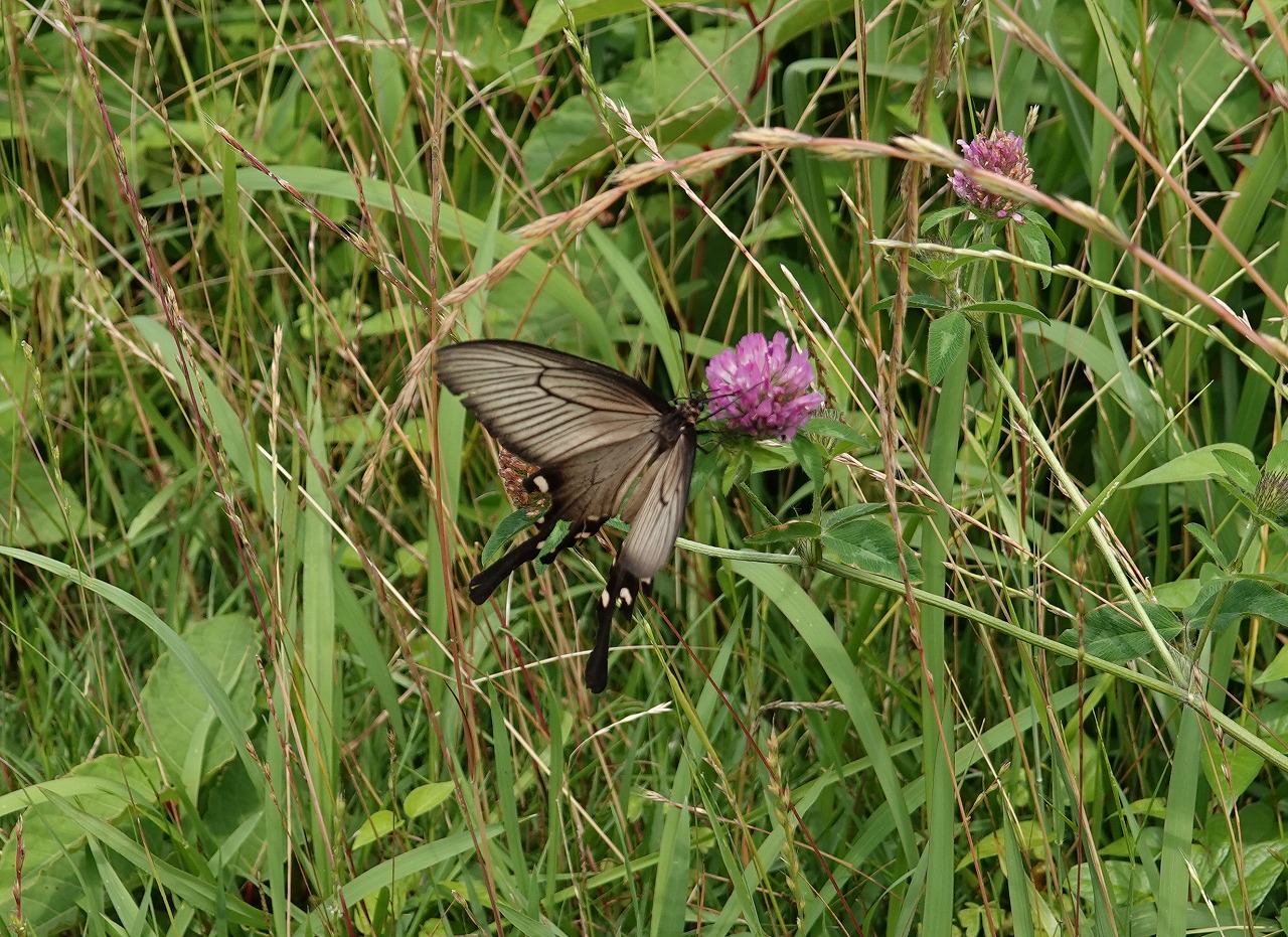 ナヨクサフジで吸蜜するジャコウアゲハはかなり傷んだメスだったが、このところ見る機会が少なくなったので久しぶり。ゆるやかな飛翔でアカツメクサに移動した。