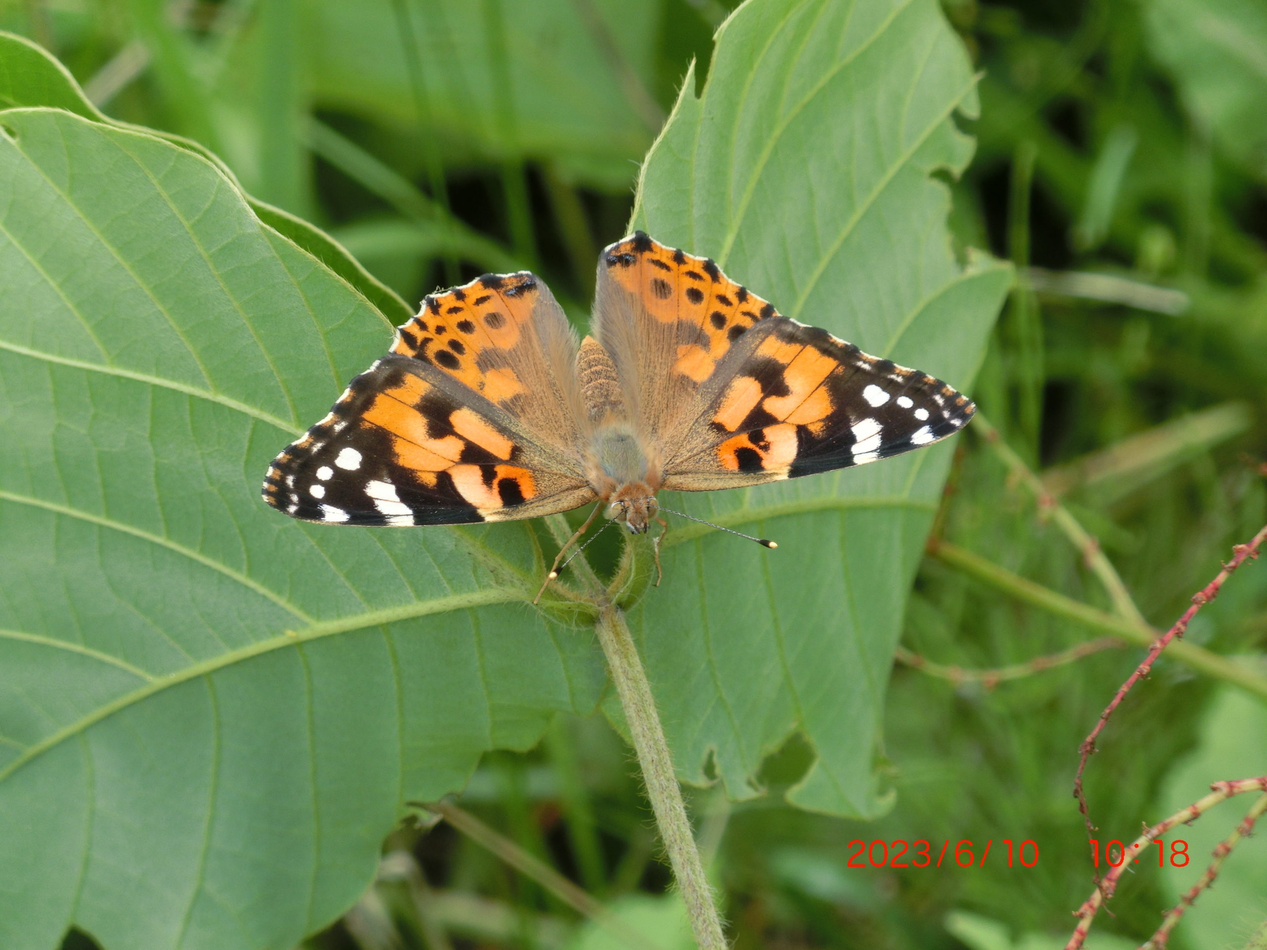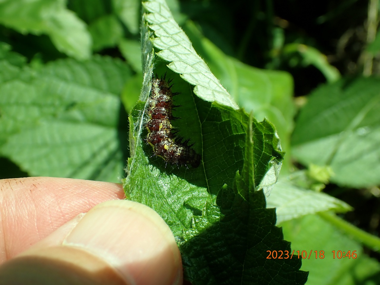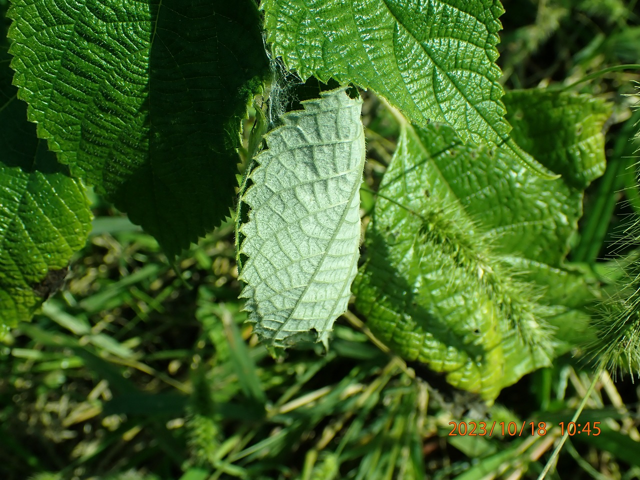 アカタテハの幼虫は他のチョウの幼虫とは少し変っていて、ただ葉っぱをたべるだけではなく、その葉っぱで自ら巣を作り、そこを拠点に活動する性質がある。多少ざらざらとしたカラムシの葉っぱを縦に二つ折りにして餃子を作る時と同じ要領で自分が吐き出す糸で綴じ、ちょうど餃子型の巣に仕上げるのだ。カラムシの葉裏は白っぽいので、緑の葉の中で白い餃子型の巣を探すのは比較的簡単だ。