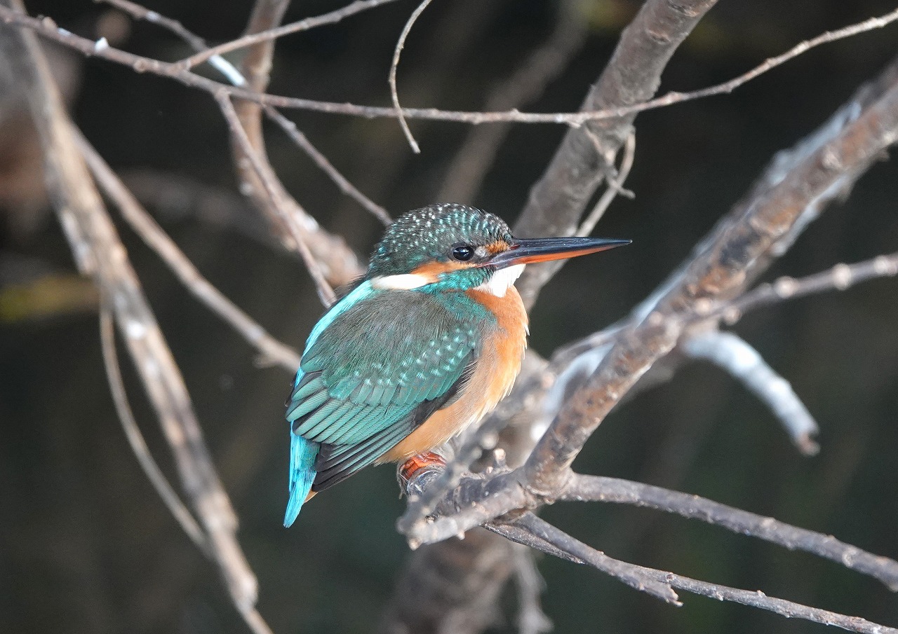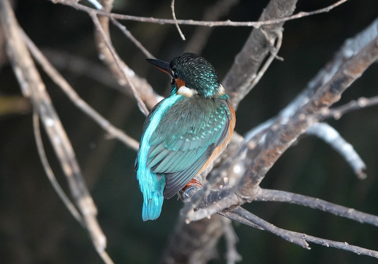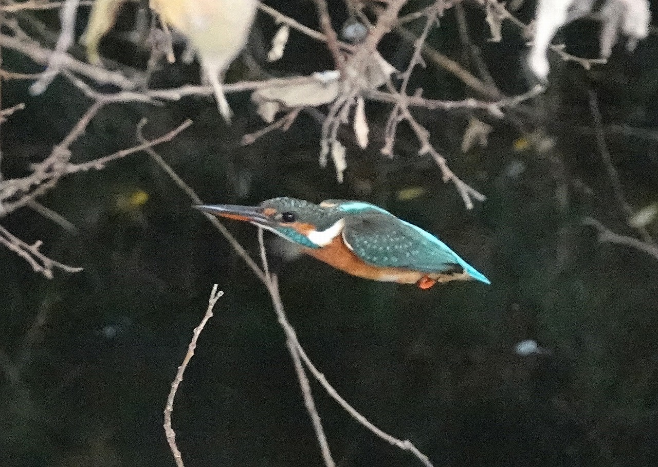 さて、本題に戻って、本流から外れて池状の水溜りの上に張り出した枝にちょこんととまるカワセミ。周囲はヒヨドリがうるさく鳴いているくらいで他の鳥も見られない中で観察を続ける。そうする内に体をねじって背中の美しい水色ラインを披露した直後に枝の込み入った中で器用に水中にジャンプして漁を開始した。残念ながら結果は不調、その後場所を移動して見通しのいいところにとまってくれた。