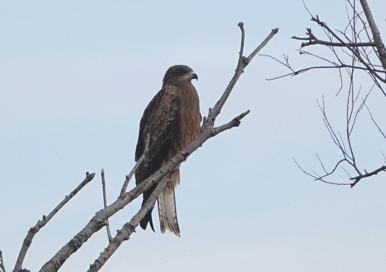 ↑ カワセミの漁はしばらく続きそうだったが撮影するには足場が良くなく諦めて池をあとにして上流の上河原堰方面に向かう。川の中州では高木の頂部にトビが微動だにせずとまっていた。