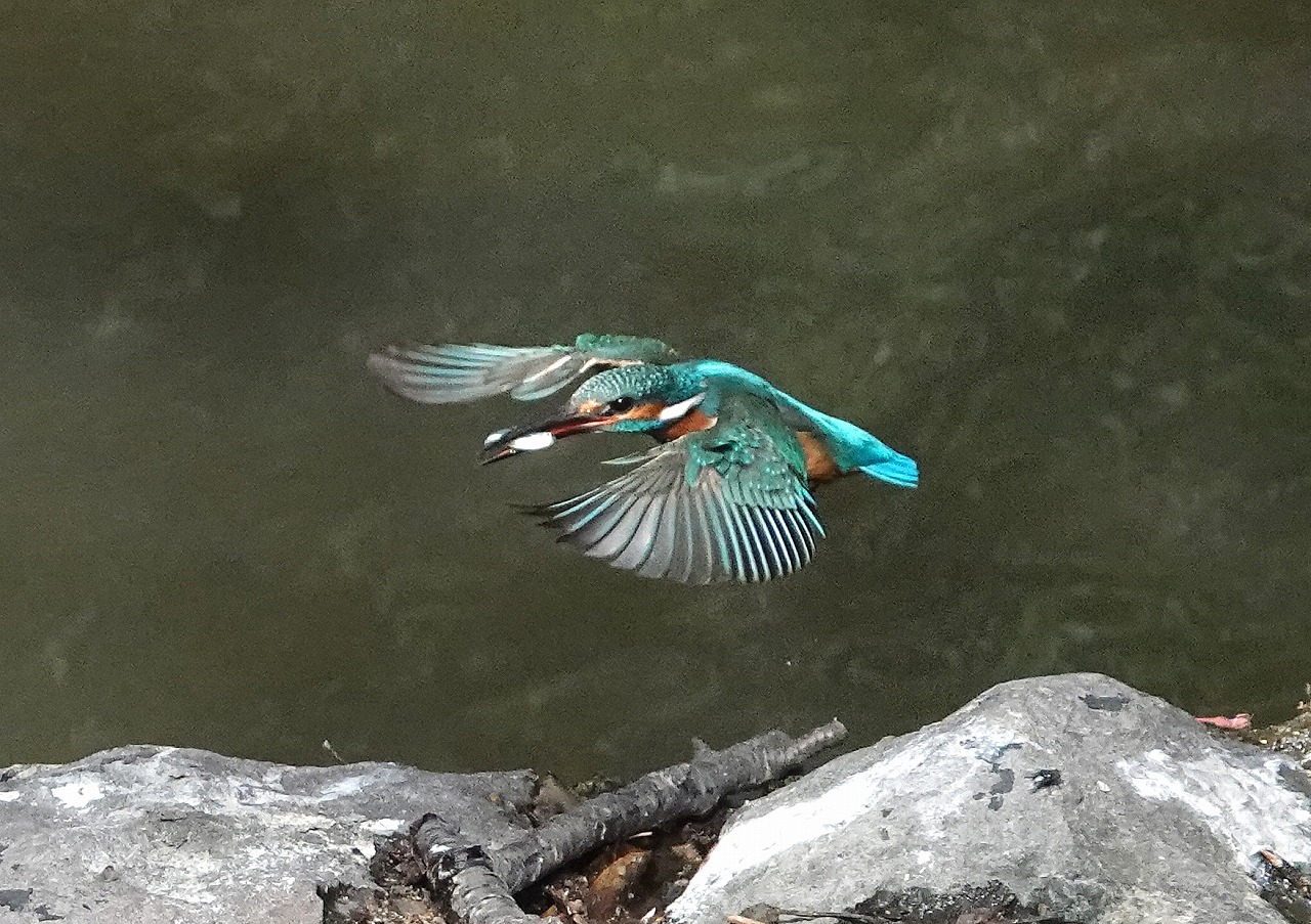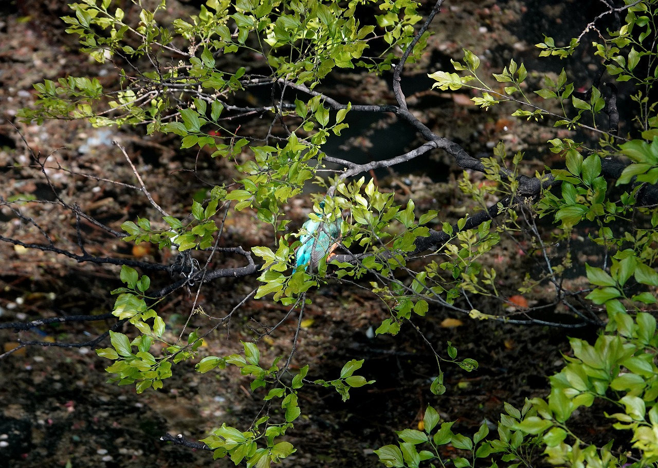 これまでの何年かの観察経験からカワセミは割と几帳面に同じ時間帯で行動すると思っている。従って前回見た時より15分ほど早目に駅に到着して橋の上で待っていると、数分で鳴き声が聞こえさらに1分で姿を現わしまたもや滝部中央にある恰好なとまり木にとまった、メスだ。予想的中!ということで撮影していると急に飛び立って廻りの枝に身を隠した(つもりだろう)。