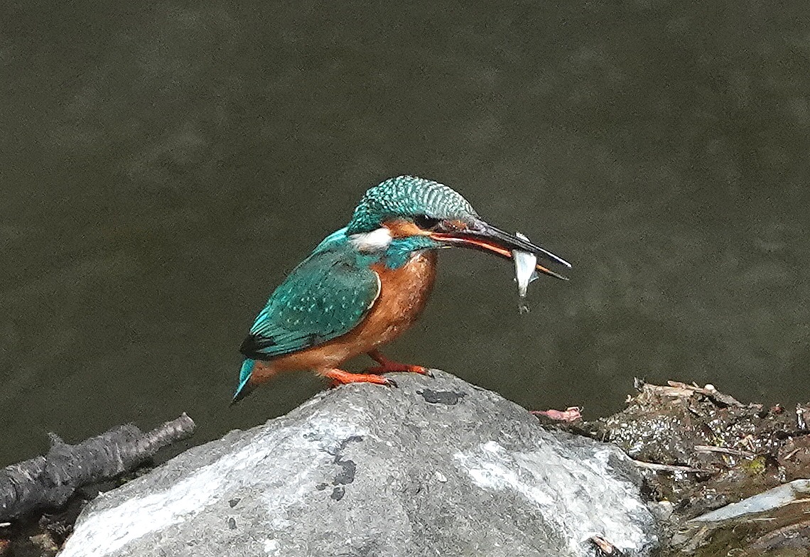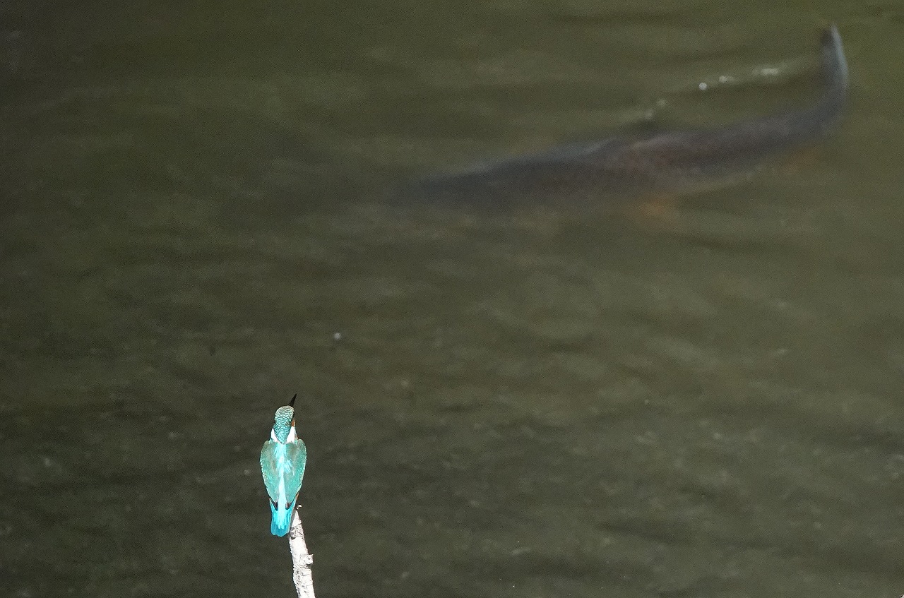 ↓ エーッ?! ウソだろ?? オスだ!! いつの間に入れ替わったのだろう? オスの嘴は上下とも黒、一方、メスはトップ画像のように下が赤い。コサギに目をとられていたとはいいながら、カワセミにつままれた気分・・・