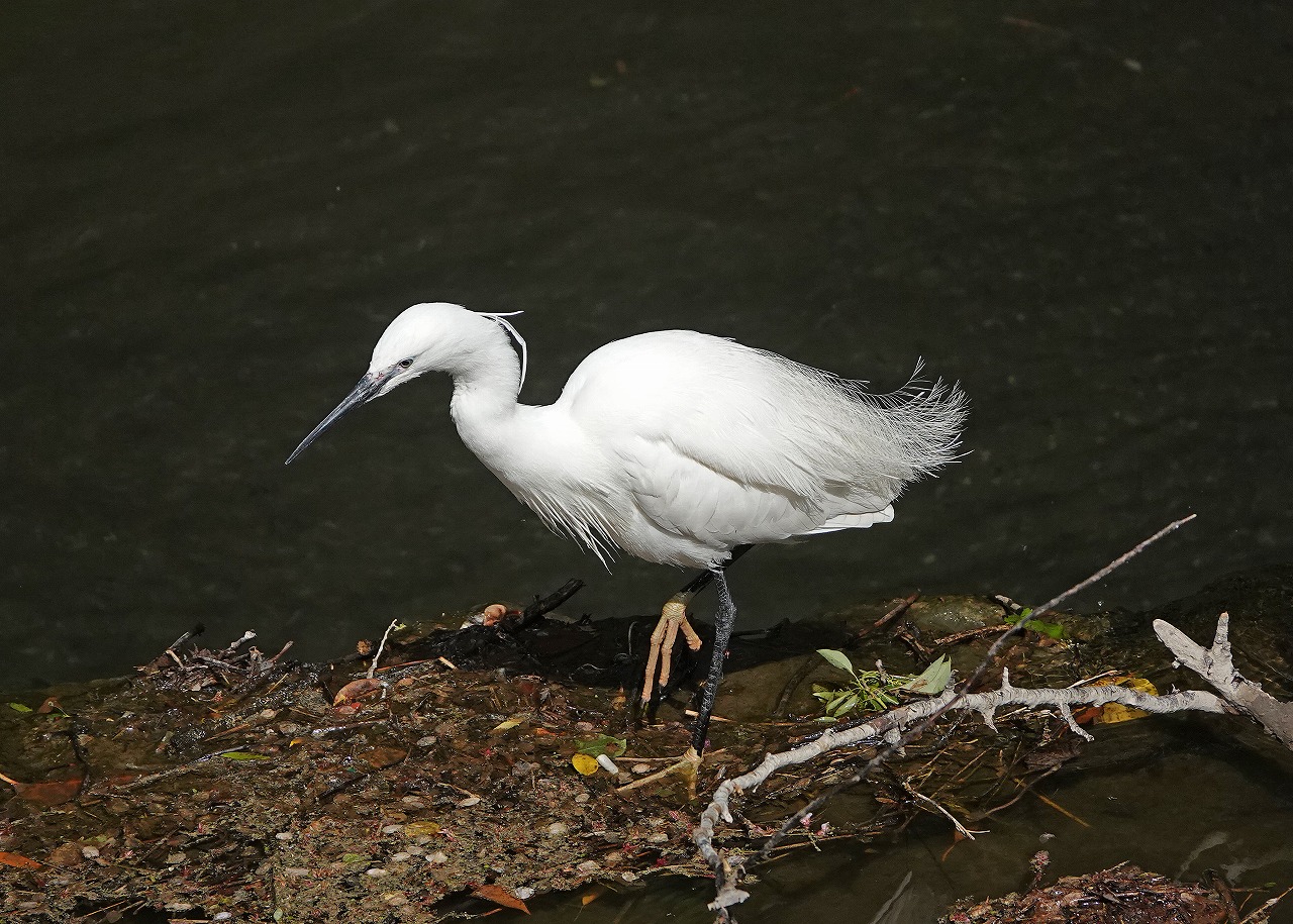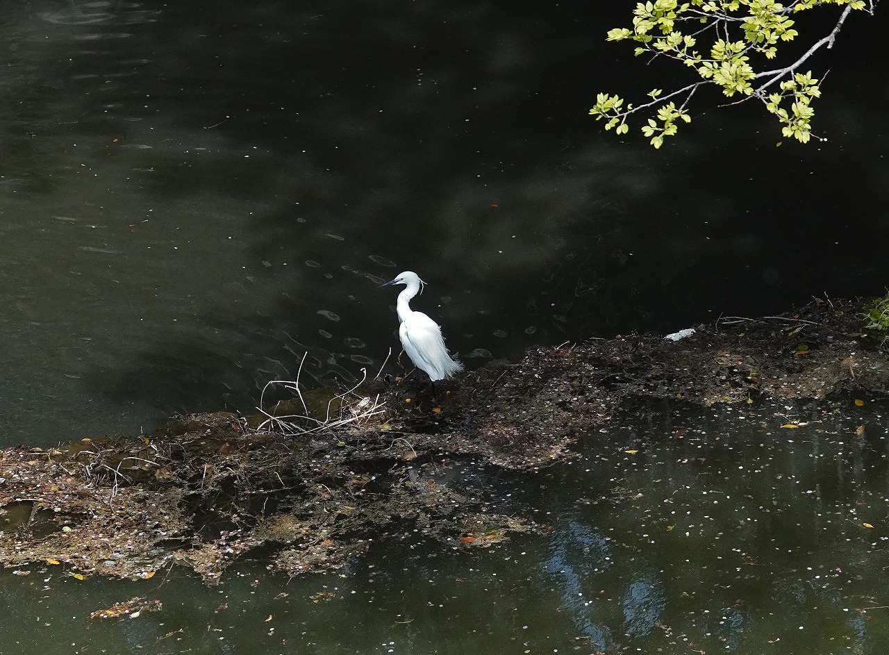 ↓ 原因判明、すぐにコサギが現われた。一緒に居るところはこれまで多摩川でも何度も見ているがここのカワセミは明らかにいやがっている。襲われたりはしないはずだが・・・まあ、コサギに比べると随分小さいのでせっかく捕えたエモノを横取りされるくらいのことは都心につきありそうだ