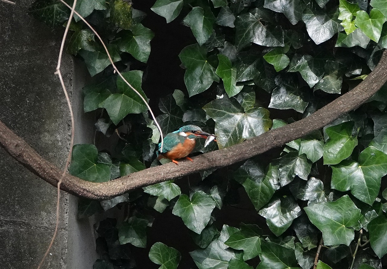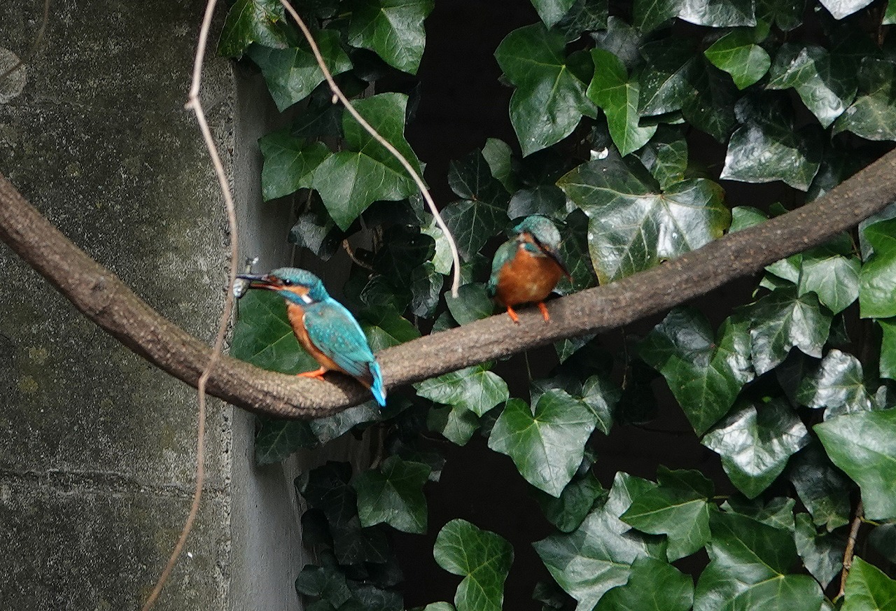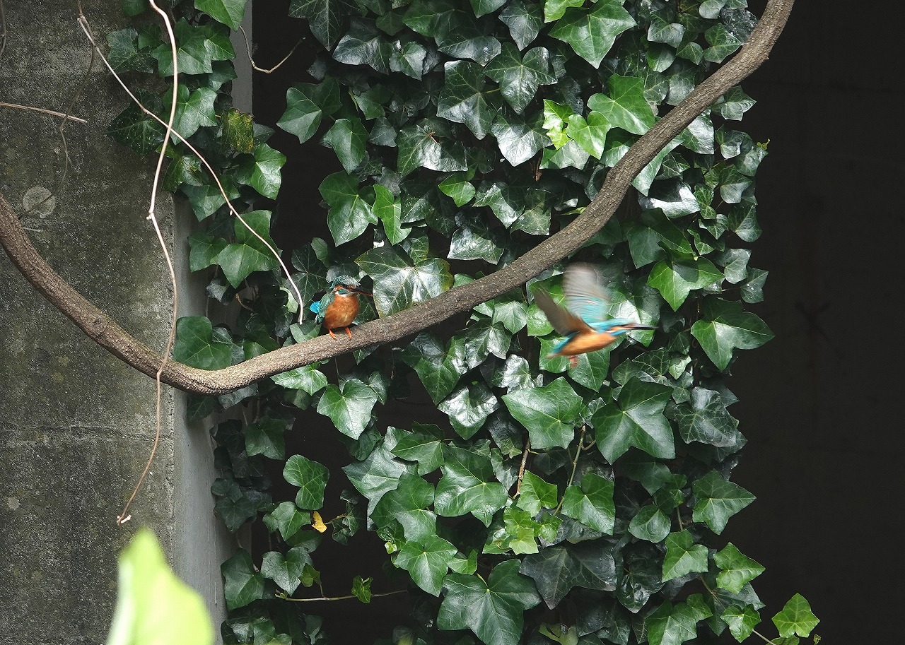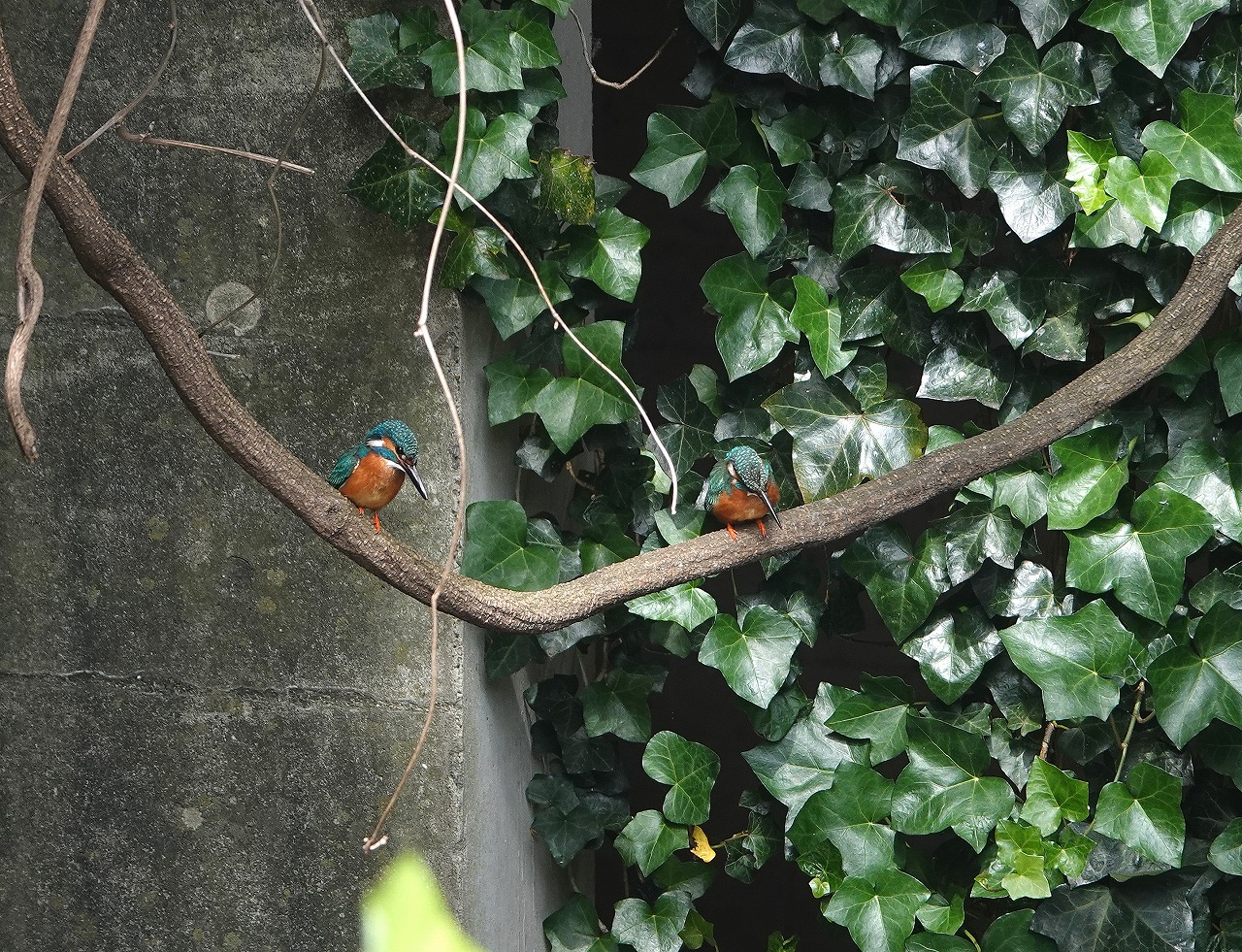 登下校時にかならず覗く駅前の外堀、今日のカワセミは奥のツタの壁に2羽ならんで下のアオサギを眺めていた。オスとメス(右)。それぞれ一羽ずつ見たことはあったし、鳴声からも2羽いることはわかっていたが並んでいるのは今回初めてだ。