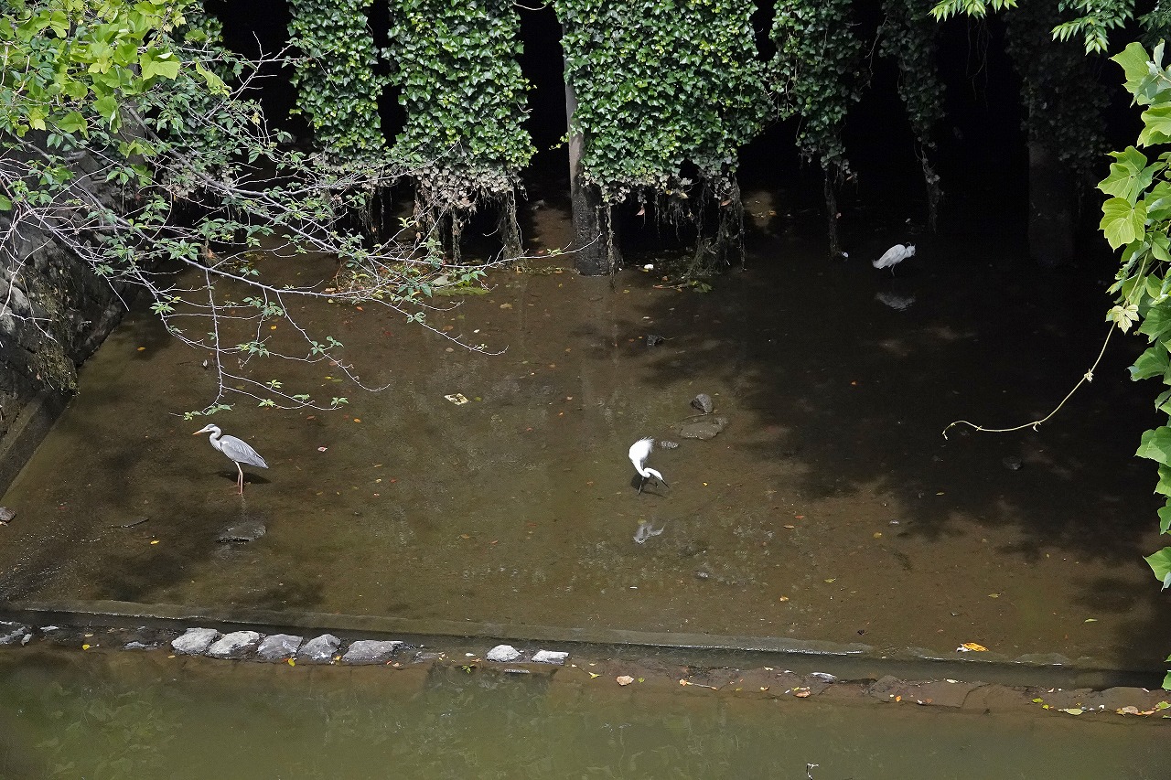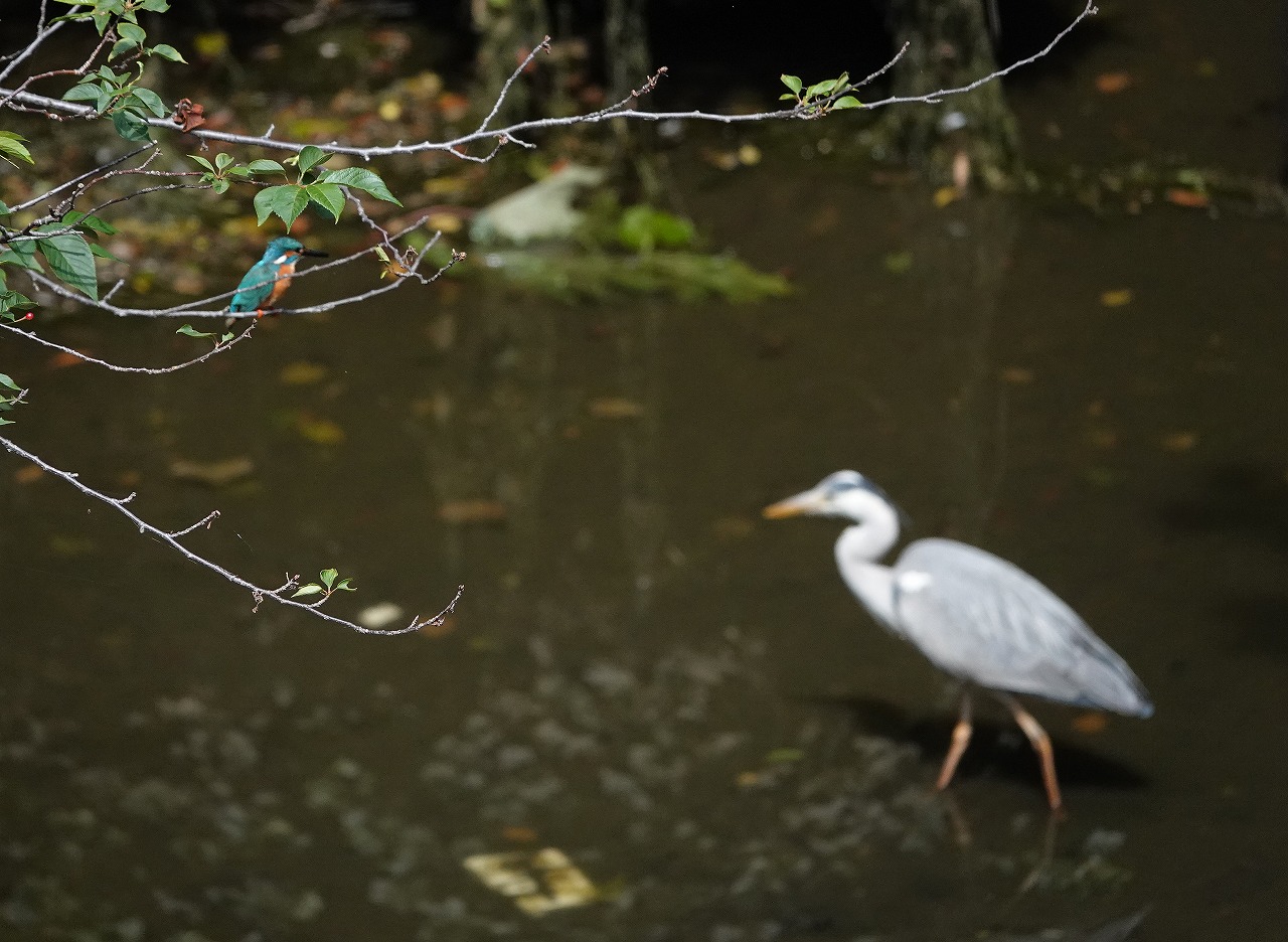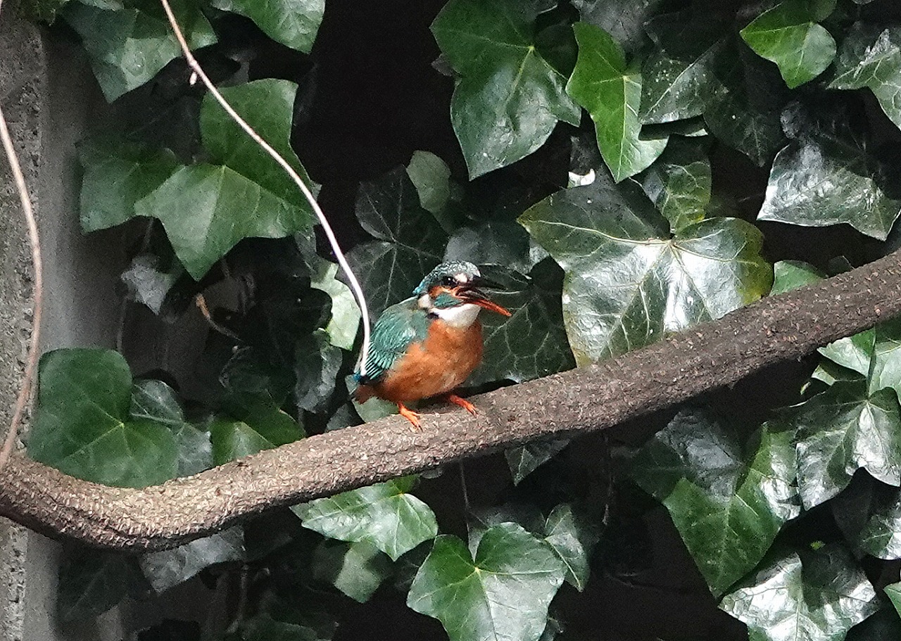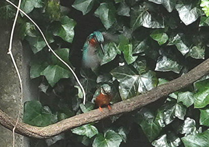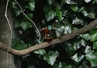 登下校時にかならず覗く駅前の外堀、今日のカワセミは奥のツタの壁に2羽ならんで下のアオサギを眺めていた。オスとメス(右)。それぞれ一羽ずつ見たことはあったし、鳴声からも2羽いることはわかっていたが並んでいるのは今回初めてだ。