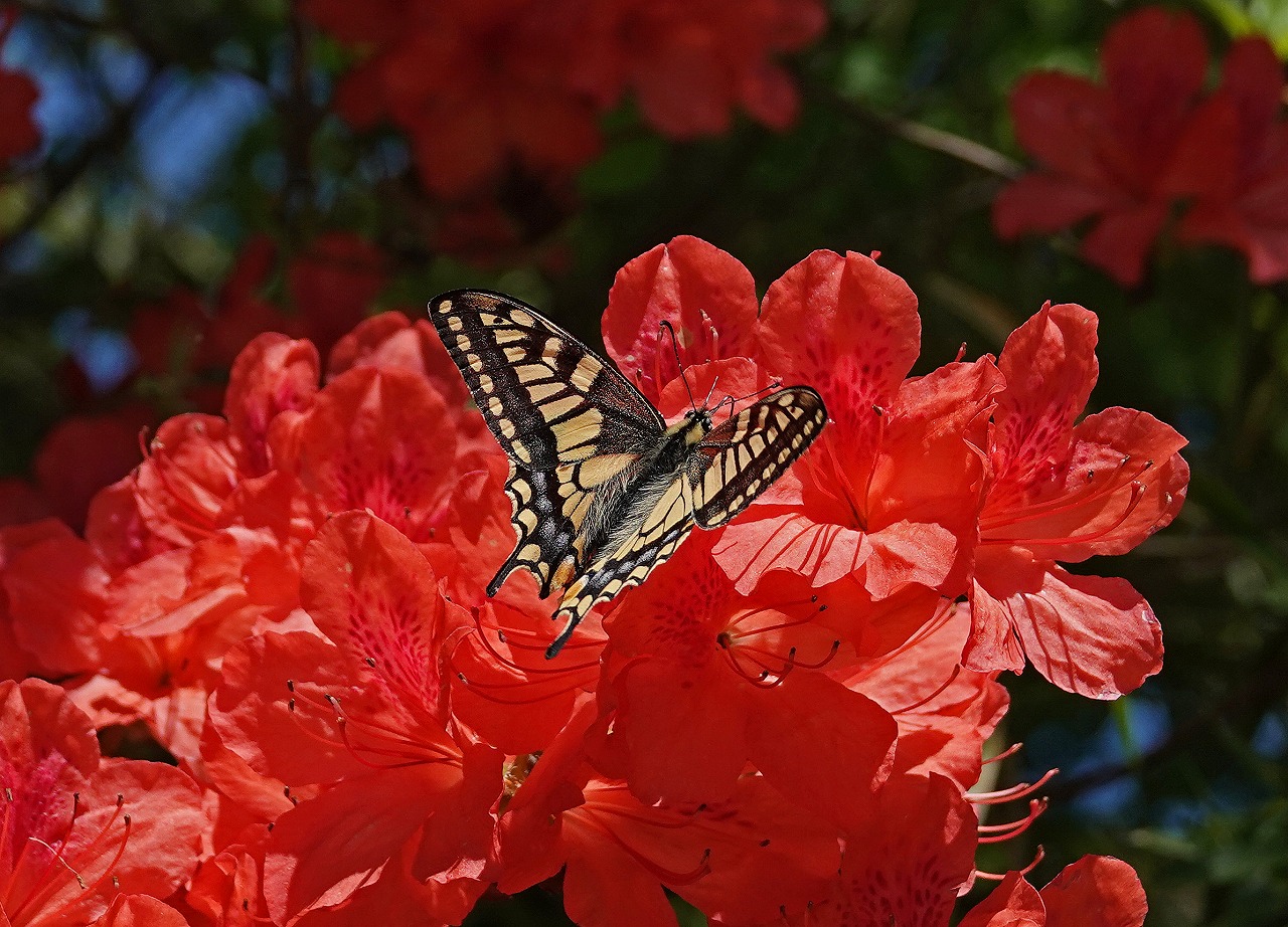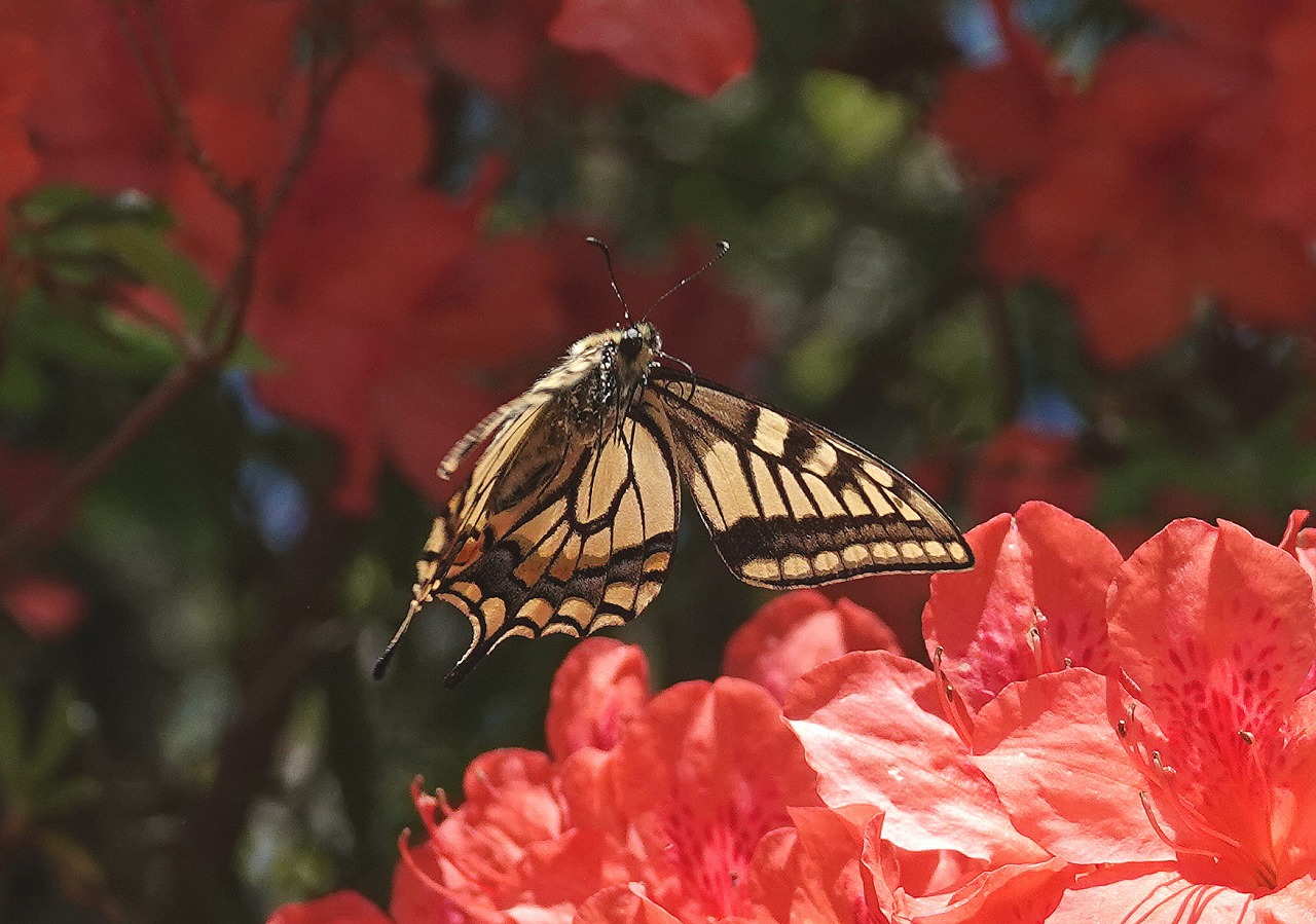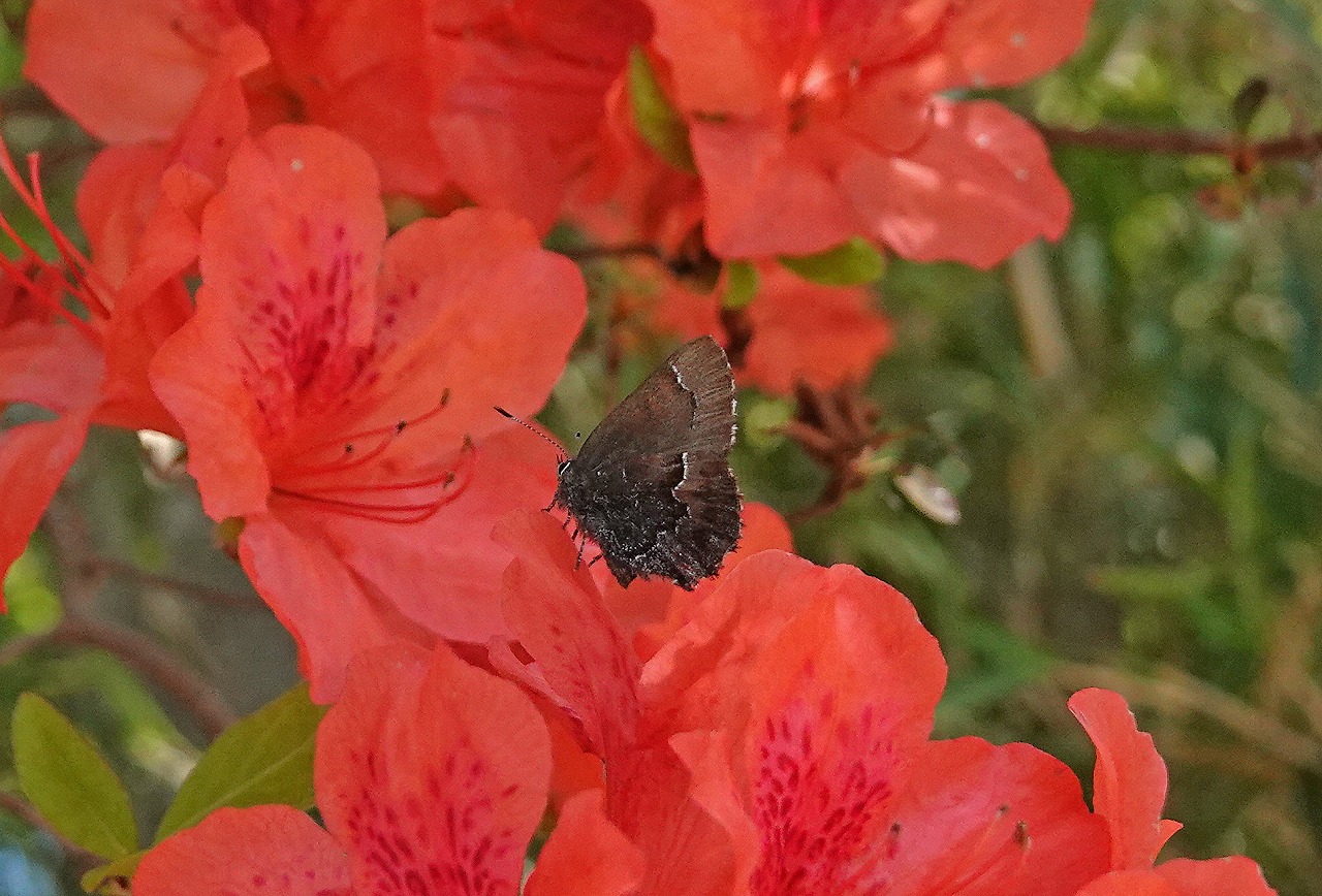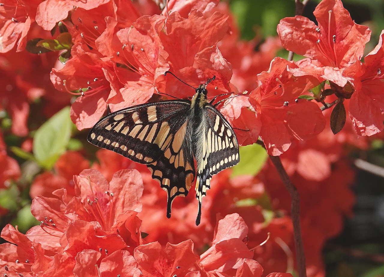 ツツジ廻り キアゲハほか 2025年5月9日 最終更新日時 : 2025年5月6日 Mats ミヤマカラスアゲハが訪花するヤマツツジにはほかの蝶たちも飛来しています。Mats キアゲハの白~クリーム色の翅がツツジの色を反射して赤っぽく染まって見える。 ↓ 赤バックで目が疲れるのでちょっと一息、ミヤマカラスアゲハ ↓ キアゲハに戻って ↓ コツバメが飛来。花弁上でモゾモゾ動いてどうやら産卵行動のようだが角度悪く確認できない。ただ花弁に産卵だとするとどうみても孵化する前に落ちてしまいちょっとまずいのでは?