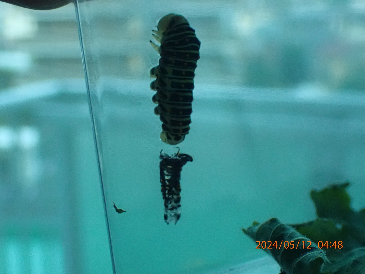 | ↑ 飼育箱の壁に貼り付いた4齢が脱皮して最終5齢となった。 その下には脱皮殻が残っていたが、その後食べてしまった。 | ↑ できたばかりの5齢は体の部分はキアゲハ特有の黒と緑の縞模様だが、頭の部分はなぜか真っ白。これは脱皮に失敗したのかと思ったが 徐々に色づいて来る。 |