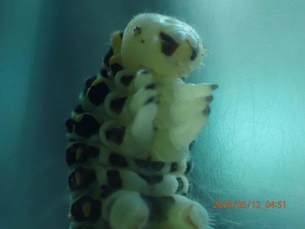 | ↑ 飼育箱のプラスチックを通して腹側から見たところだが、何とも愛嬌のある表情をしている。 | ↑ キアゲハ5齢 この頃には大量の葉っぱを食べる。新鮮な葉っぱを頻繁に調達することになる。 |