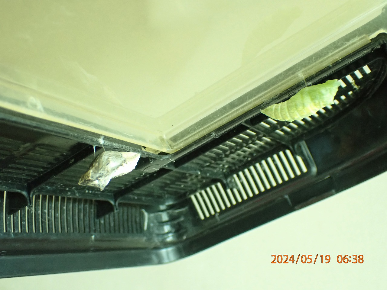 | ↑ 前蛹。飼育箱の天井に貼り付いて前蛹となる。中には壁面に貼り付くものもいる。 飼育箱の中には蛹が止まれるように何本かの枯れ枝を立ててやったのだが、どれもそれは気にいらなかったようだ。 |