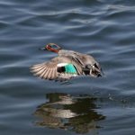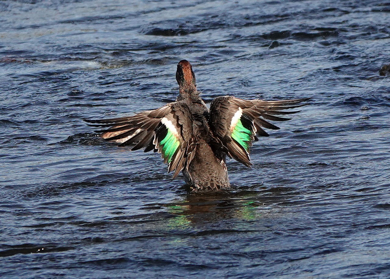 この翼鏡(緑の部分)の構造色の輝きは強烈で水面にも反射している。普段なかなか全面的には見せてくれずチラ見せが多い。