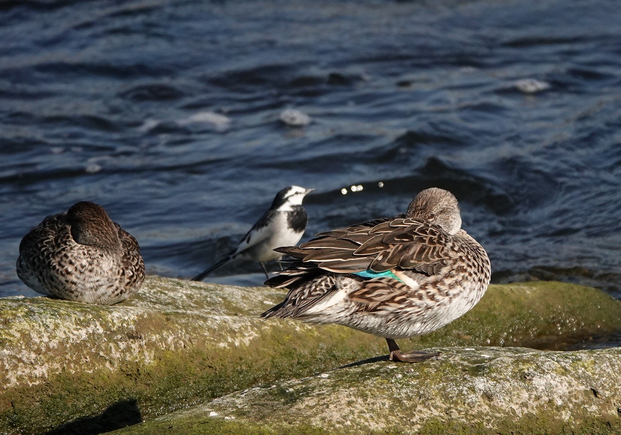 コガモが水面に浮かんだり岩にとまっているとチラリと緑に輝いて見えるのが「翼鏡」と呼ばれる羽の部分で、羽を広げたり、飛ぶ時にはその全体を確認できる。構造色(それ自身には色がついていないが、その微細な構造によって光の干渉が起こるため色づいて見え、また見る角度によって異なる色となる。シャボン玉、CDのディスク面、或いはミドリシジミやタマムシも構造色の例)のため、緑、青、黒と微妙に変化する。オス、メスともに翼鏡があるが写真はメス。