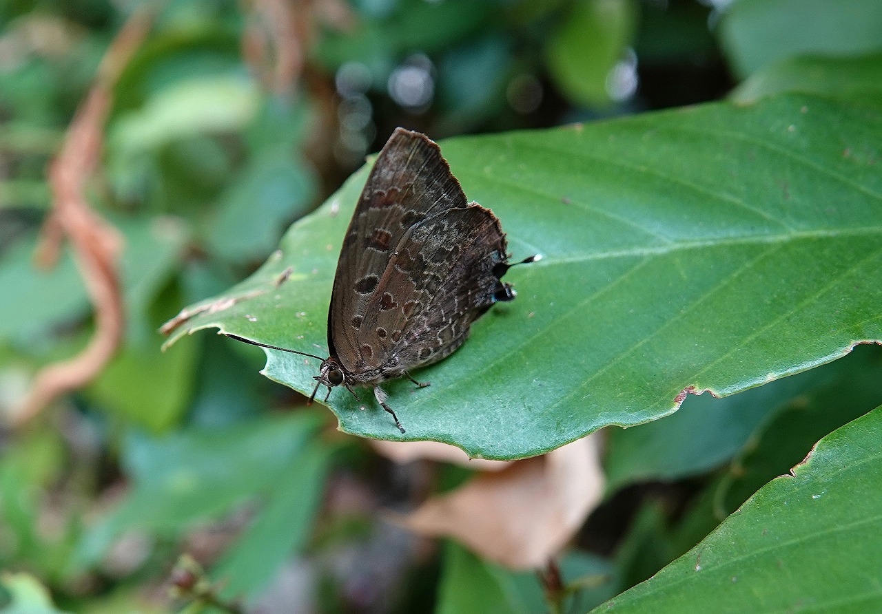 ↓ アラカシにムラサキツバメがいた。新鮮な個体。食樹のマテバシイは敷地の反対側なのだが季節を通して見られる