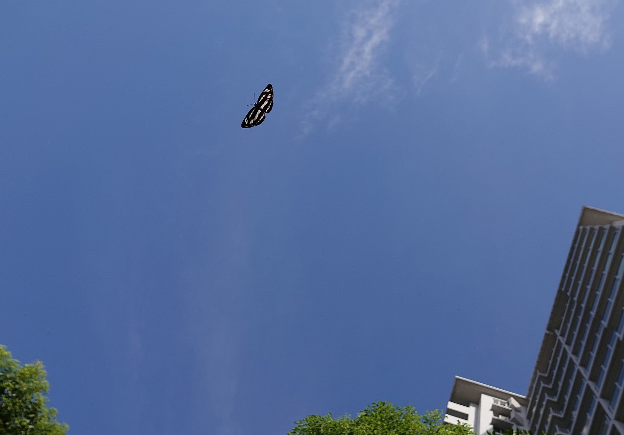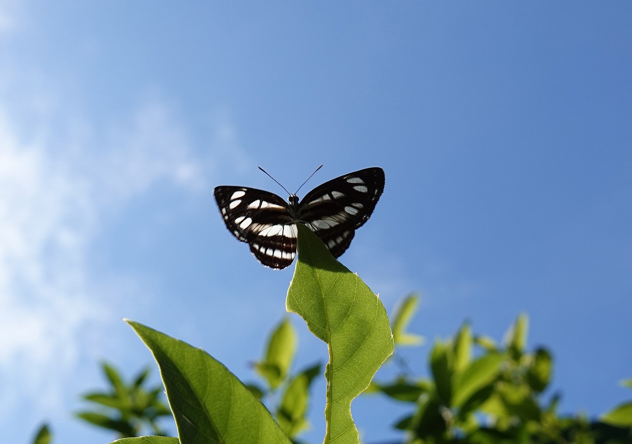 朝、ゴミ捨て・・・と卑近な話題ではあるが、まだ気温はましなのでゴミ袋両手にカメラを首に掛けて部屋を出た。敷地がけっこう広いので少し歩くのだがゴミ置き場裏には遊歩道が通っていて、アラカシ、クスノキほかの植栽が豊かである。すぐ先のアラカシの葉の先端にコミスジがいて、飛立ちの瞬間を捉えられた。実は、百日紅(サルスベリ)のピンクの花が満開なので、運が良ければこのところ割と多いアオスジアゲハが吸蜜している写真が撮れないかと期待したのだが、そうは問屋が卸さなかった。