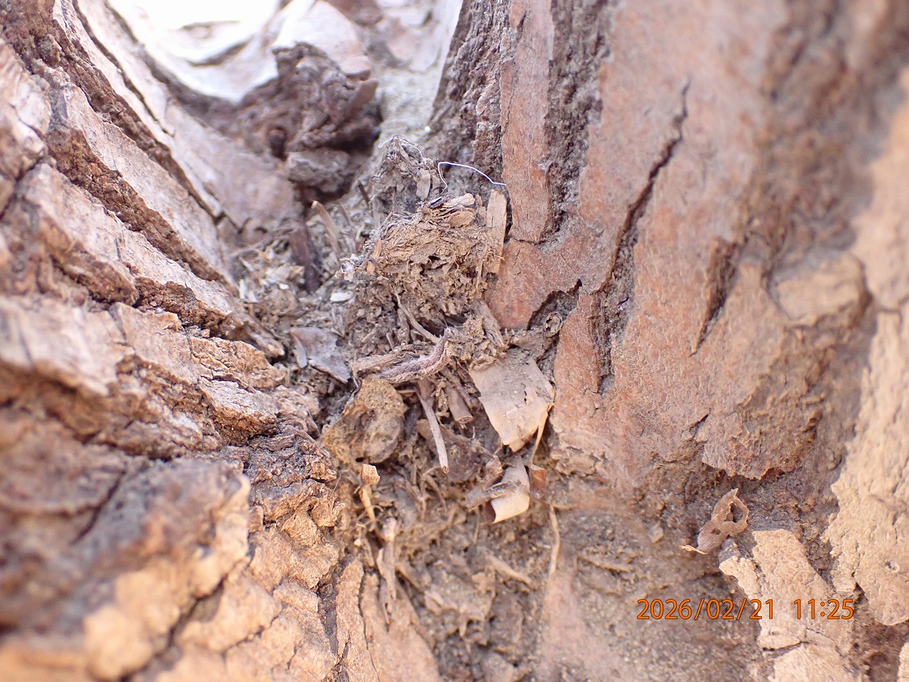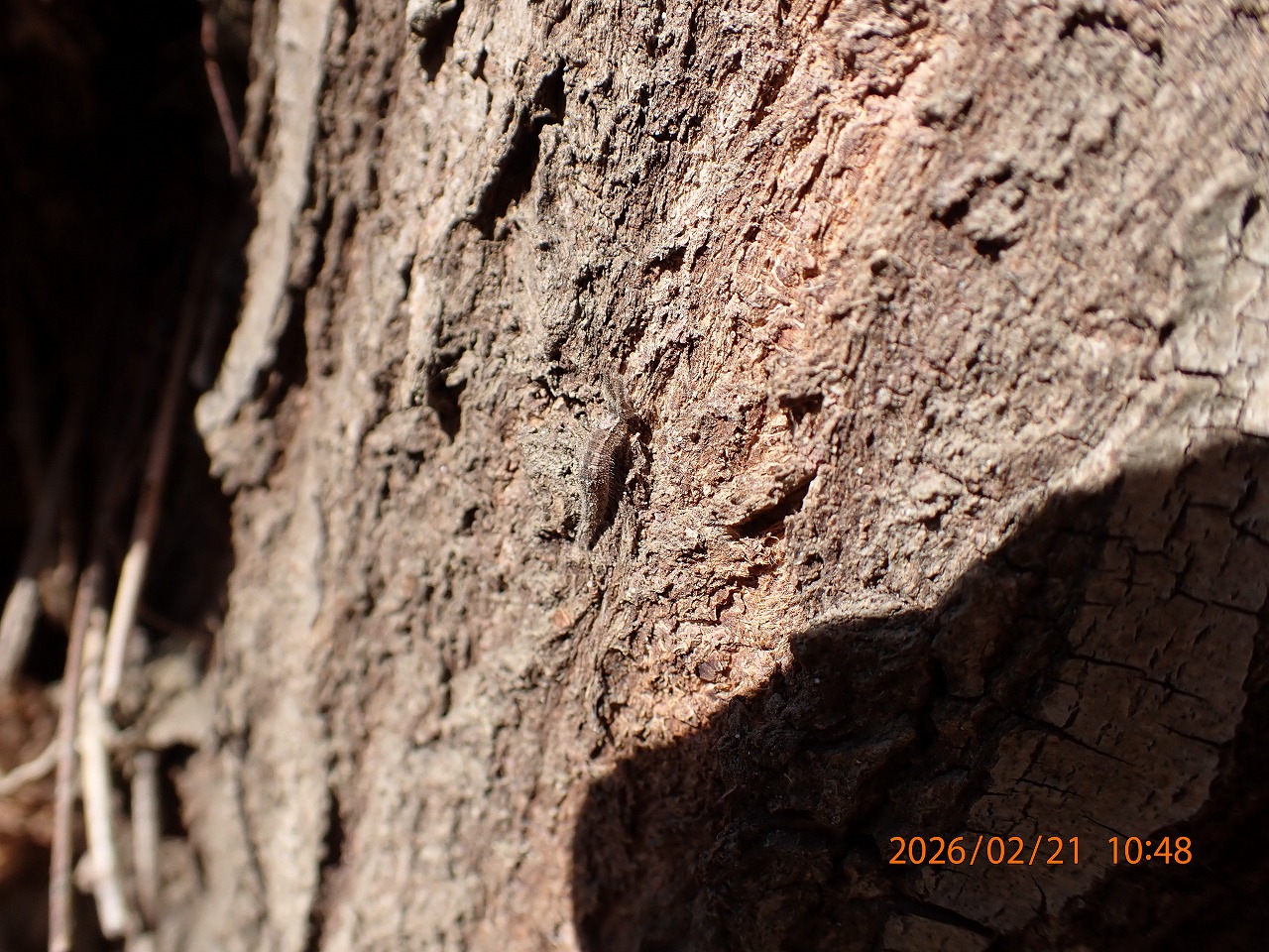 今年のコムラサキ越冬幼虫の覚醒が早いことは先の記事でも書いたとおりだが、この日「Y50」という個体が台座を離脱するところに偶然出会えた。現場に着いた時には、既に台座を離れ30cmほど幹を這い上っているところだった。この個体は2日前(2月19日)に、頭を上げ上体を大きく反り返す動きをしていたので、離脱が近いとは思っていた。だから、もしかしたら今日はもういなくなっているのではと思いながら見てみると、まさにその最中だった。おそらく15分くらい前に台座を離れたのではないか、そんなタイミングだった。もう2-30分早く現場に着いていれば、台座を離れる瞬間も見られていたかもしれない。少し残念。