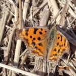 秋が深まるこの時期に特に目立つのがキタテハです。だんだんチョウの種類と個体数が少なくなるので、余計にキタテハの活発な活動が目立つように思えるのかもしれません。意外に警戒心が強く、止まっていてもすぐ飛び立ってしまいますが、この一枚は至近距離で大きく開翅しているところが撮れました。多摩川土手でコセンダングサで吸蜜中。