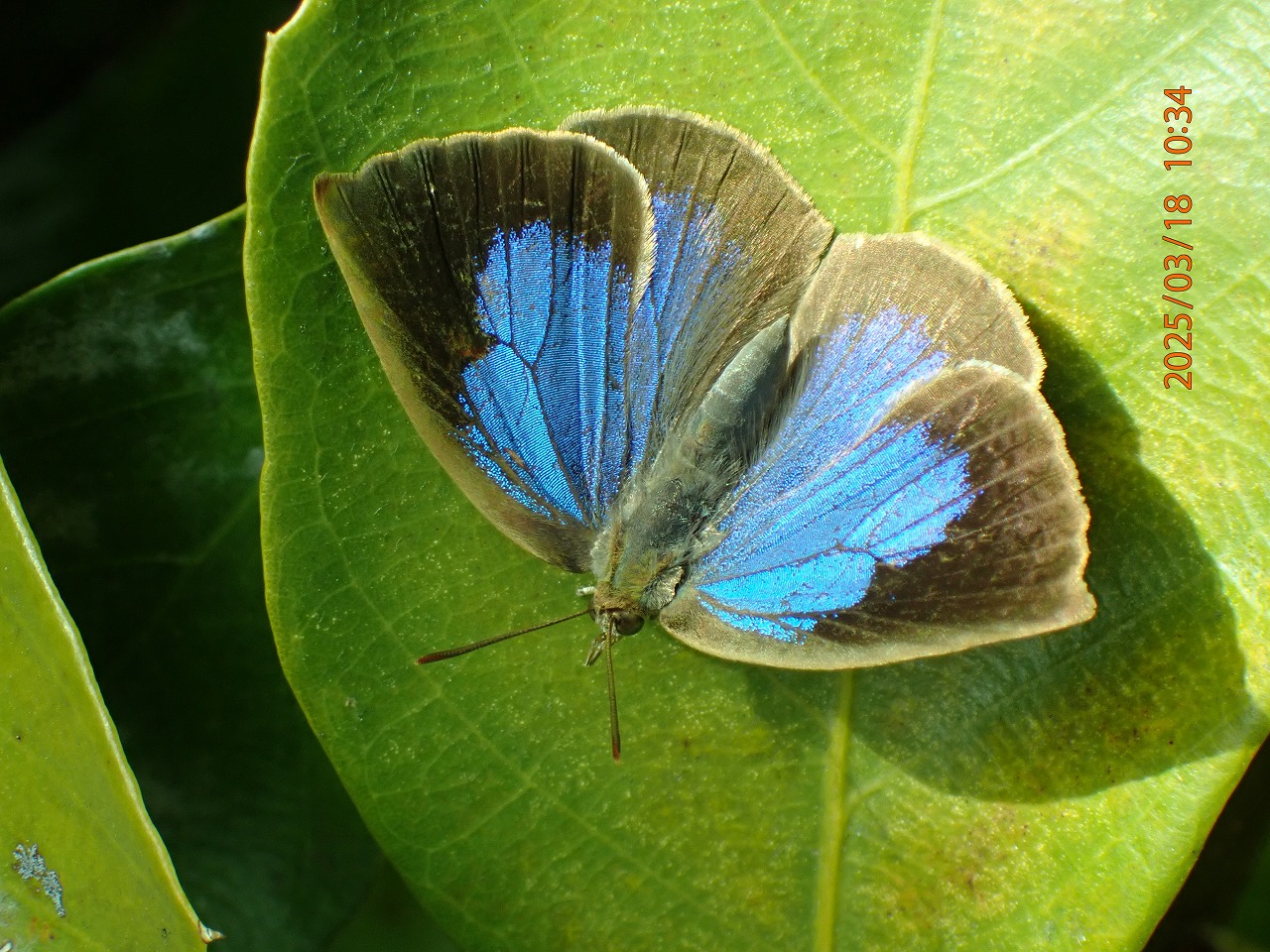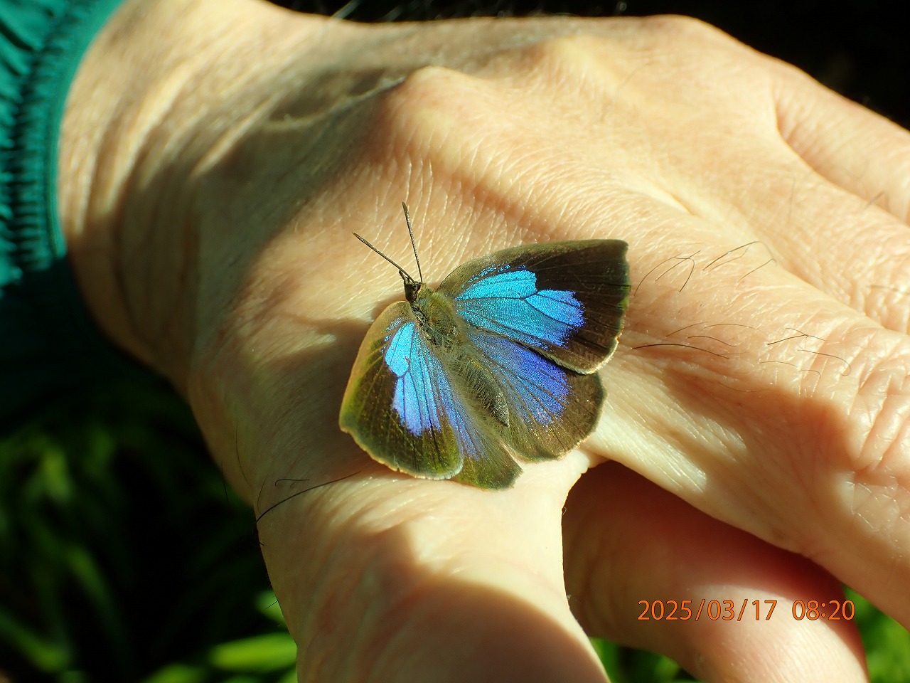 3月10日まで一緒に越冬していた3頭、暖かく(?)なるにつれてそれぞれが別行動を始めたが、その後も馴染んでいた枯れ葉はそのうちの誰か1ー2頭が18日頃まで代わるがわる利用していたようだ。しかし、翅を閉じたままでは翅裏の模様しか見えず、そこにいるのがどの個体だか殆ど見分けがつかない。ただ、運よくネグラを離れて陽射しの下で日光浴をしているところが何枚か写真に撮れていたので改めて比較してみた。すると、確かに3頭の違う個体であることが青い鱗粉の形、剥がれ具合から分かったのだ。特に、右前翅にご注目ください。やはり、彼らがあの時の3頭であったようだ。