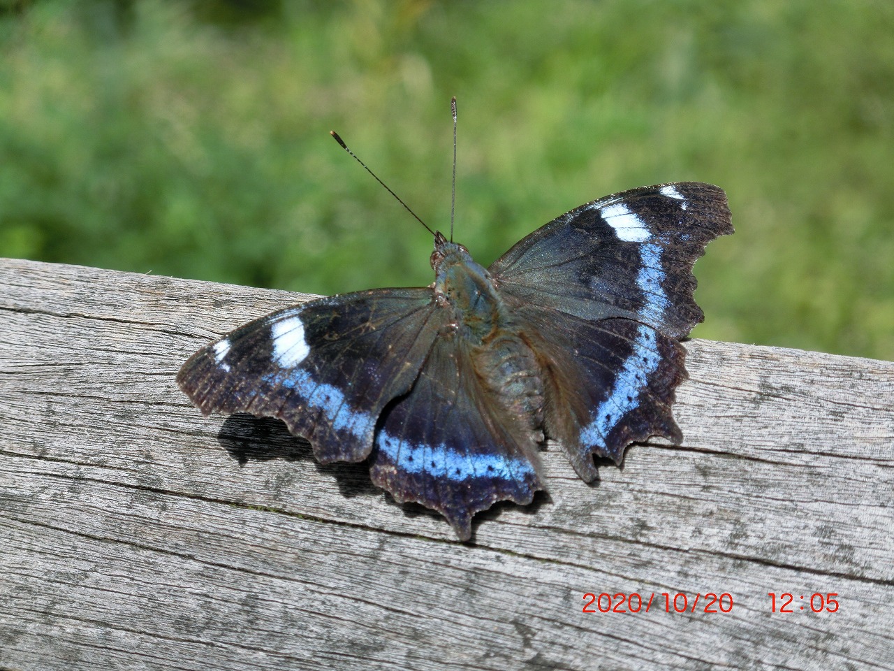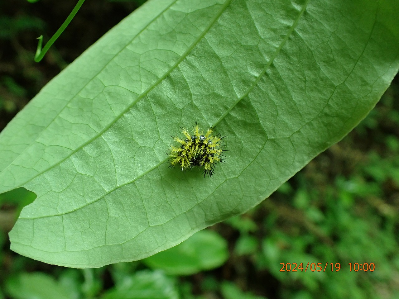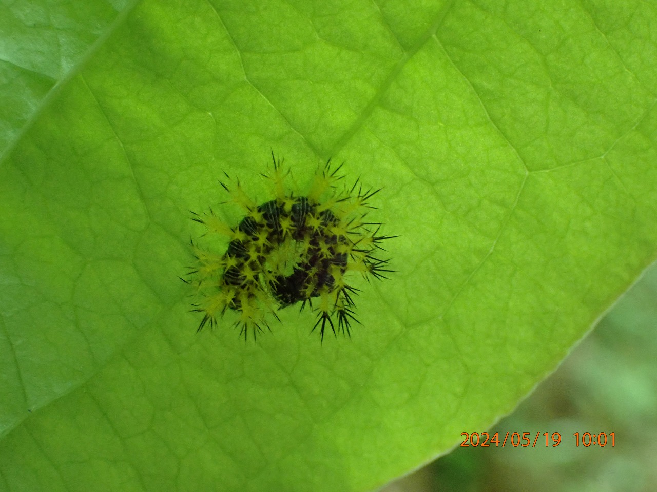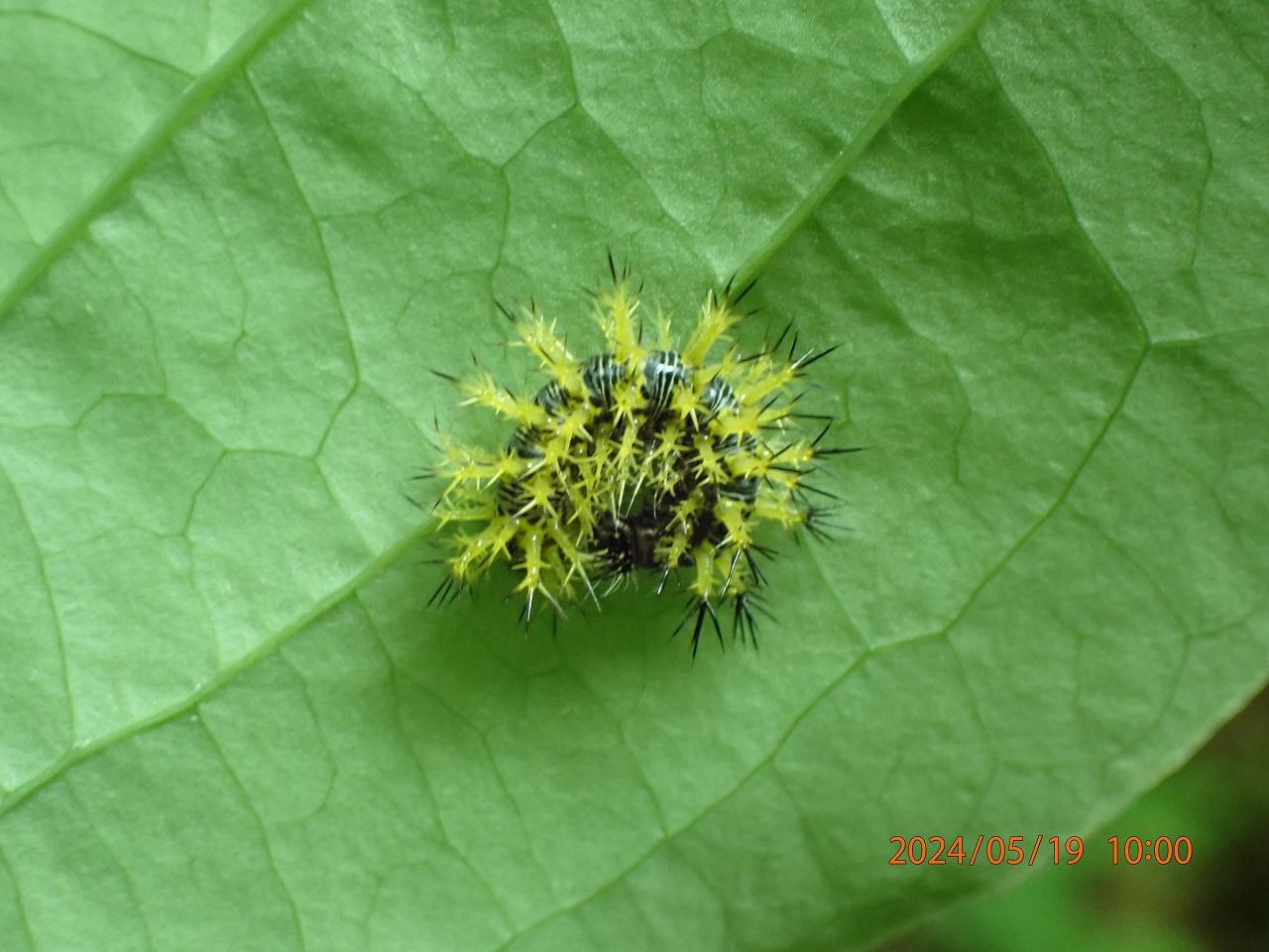 そして、この葉っぱはサルトリイバラというルリタテハの食草で、この植物も茎にはたくさんの鋭いトゲがあります。しかし、この幼虫は見た目には怖そうで、とても触る勇気が出ませんが、毒毛虫のような毒はありません。見た目で、警戒感を起こさせる見事な保身術といえるでしょう。