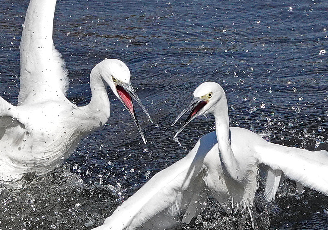 凄まじい形相で争うコサギ、何が原因か知るよしもないがのどかに並んでいた2羽がいきなり「殴る蹴る」状態に突入してもつれあった。姿が優雅なサギだけに遠くからだと前衛的なダンスのようにも見えるだろうがもちろん本人(?)同士はそれどころではないだろうし、もとよりこの尖った嘴(くちばし)は立派な凶器でもある。ただ、強弱にかなり差があるようで早々と勝負は見えてきた・・・