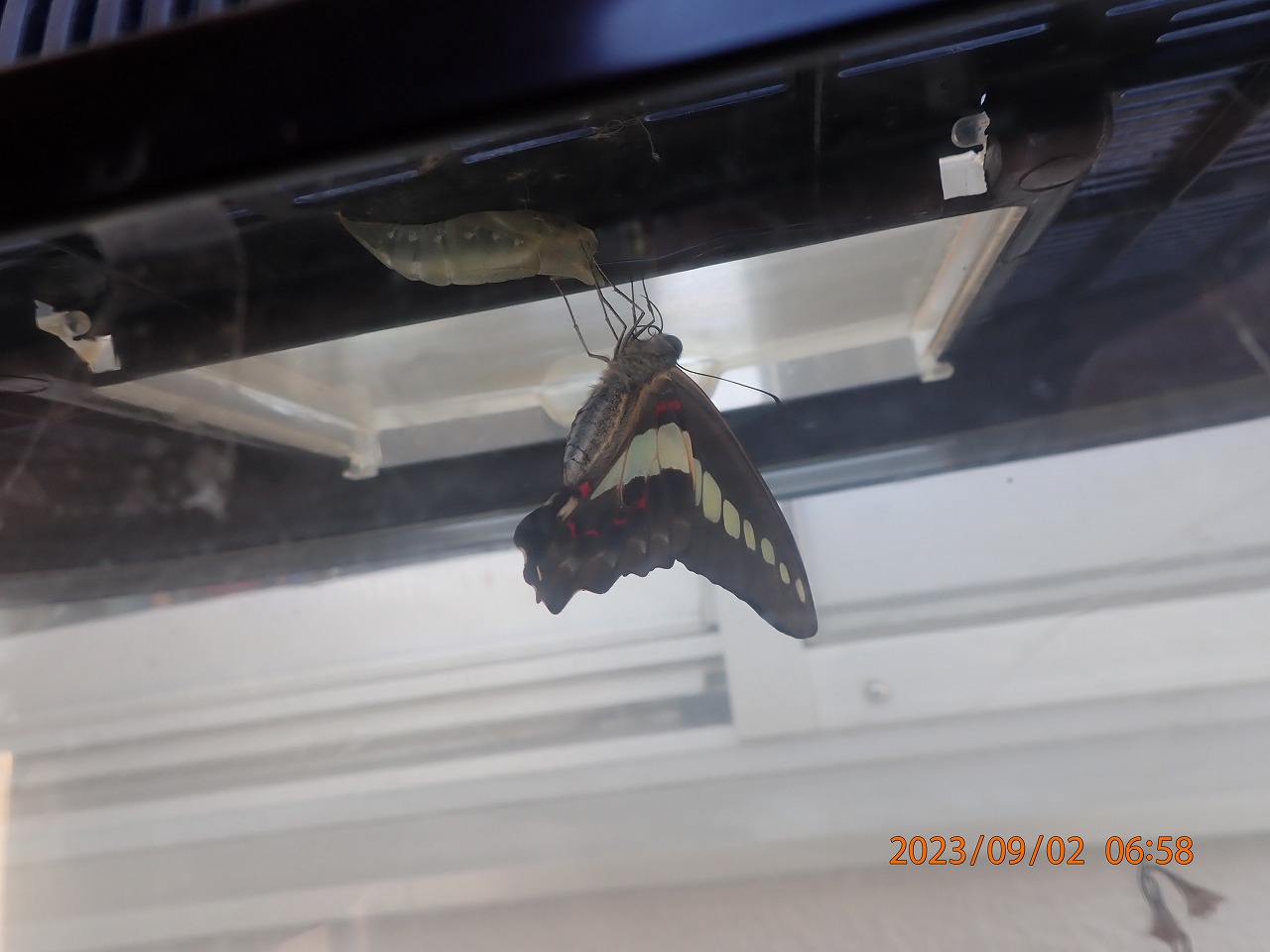 ということもあってか、夏場を通してアオスジアゲハをよく目にするのだが、今年はなぜか少し様子が違い例年よりもずっと数が減ったように感じられた。毎年のようにアオスジアゲハの卵や幼虫を見つけては飼育をしていたのだが、今年はそんなわけでそのチャンスも殆どなく、一度だけ終齢幼虫を見つけ我が家に連れて帰った。ヤブニッケイの小さい枝も一緒に飼育箱に入れてやったがあまり食べないまま早々に蛹になった。幸い寄生もされてなかったようで無事羽化することができた。