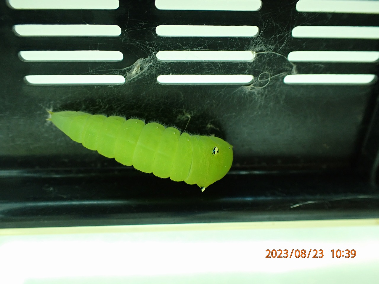 飼育箱の天井で前蛹になった