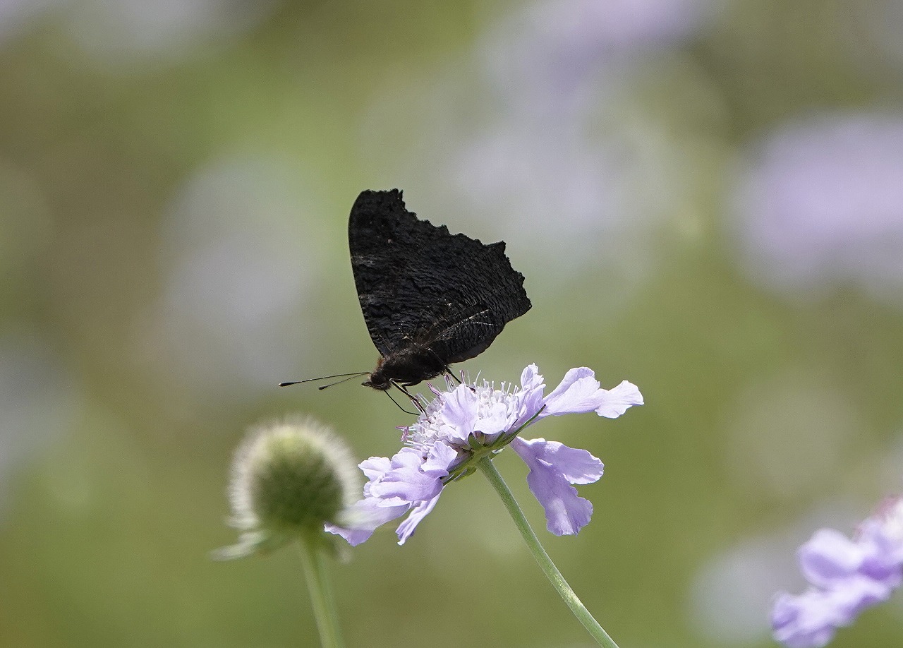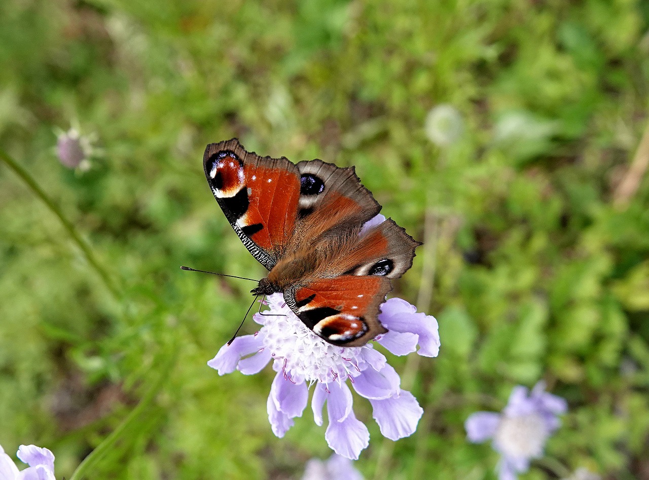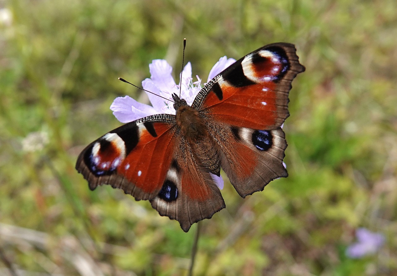 マツムシソウにクジャクチョウ、この取り合せは私の中では夏の終りの象徴とでもいうイメージがある。ロープウェイ山頂駅、標高1780m周辺のお花畑、気温も25度と多摩川沿いの自宅周辺より10度ほど低かったのでそれほど汗もかかずに撮影を楽しめた。クジャクチョウを初めて見たのは高校生の部活、生物研究部の夏の実習(実際のところは昆虫採集が主体。そのほかにバドミントン部にも属していたので羽関係に執着癖があるようだ)でおとずれた長野県美ヶ原の王ヶ頭のお花畑で見たのが初めてで、ある意味衝撃、こんな美しい蝶がいるのか?! 麓の三城石切場というところから登りついたお花畑での出逢いであった。登り口では、これも人生初のアイノミドリシジミの金緑色の飛翔、目の前での開翅を見て、こんな美しい蝶がいるのか?!・・こればっかりですが・・・というのもこの日だった。若いころは感激することが結構頻繁にあったようだ。