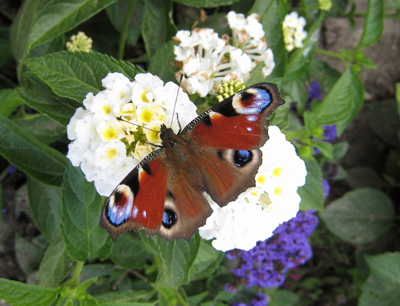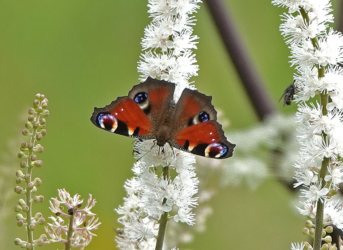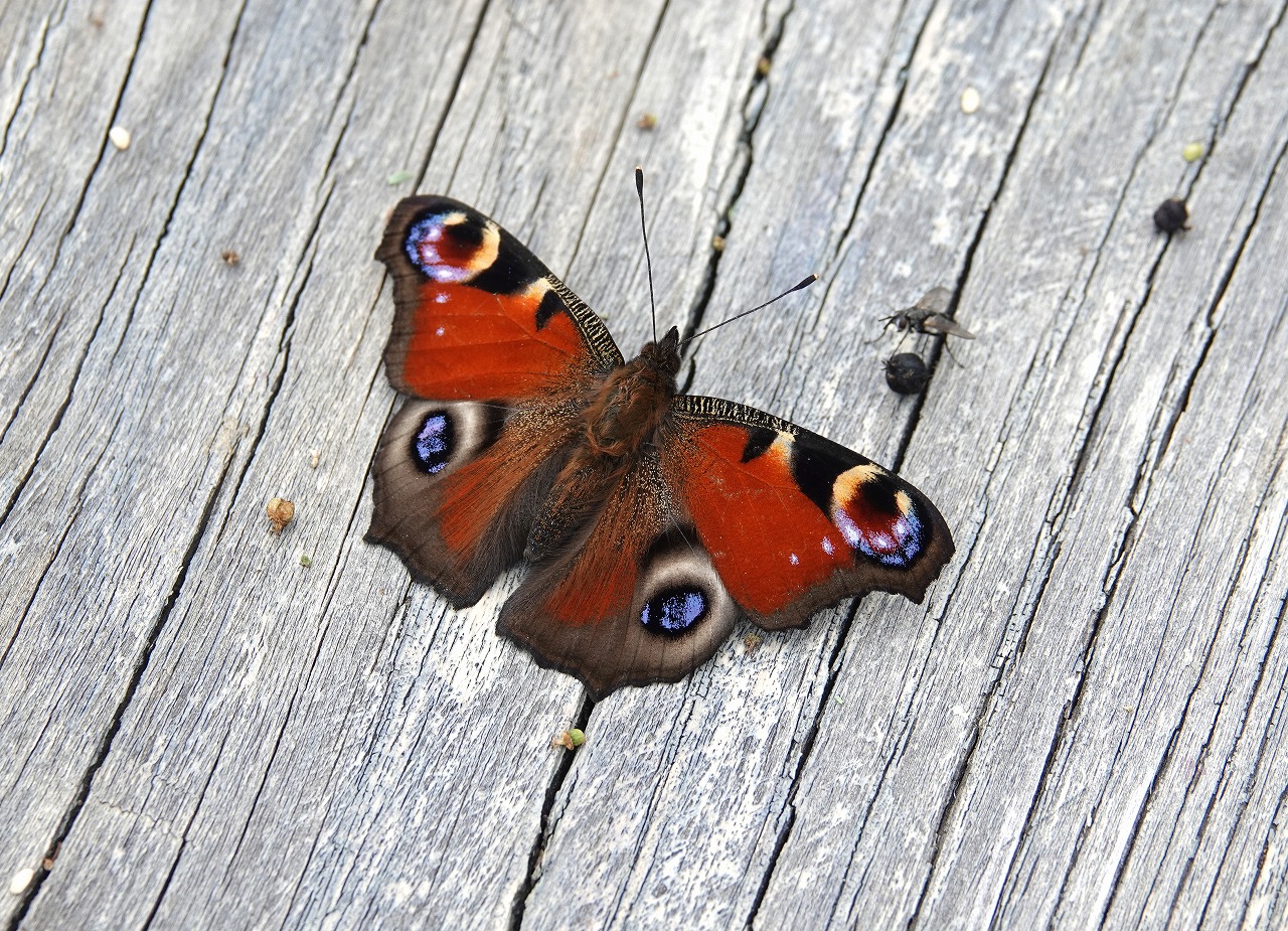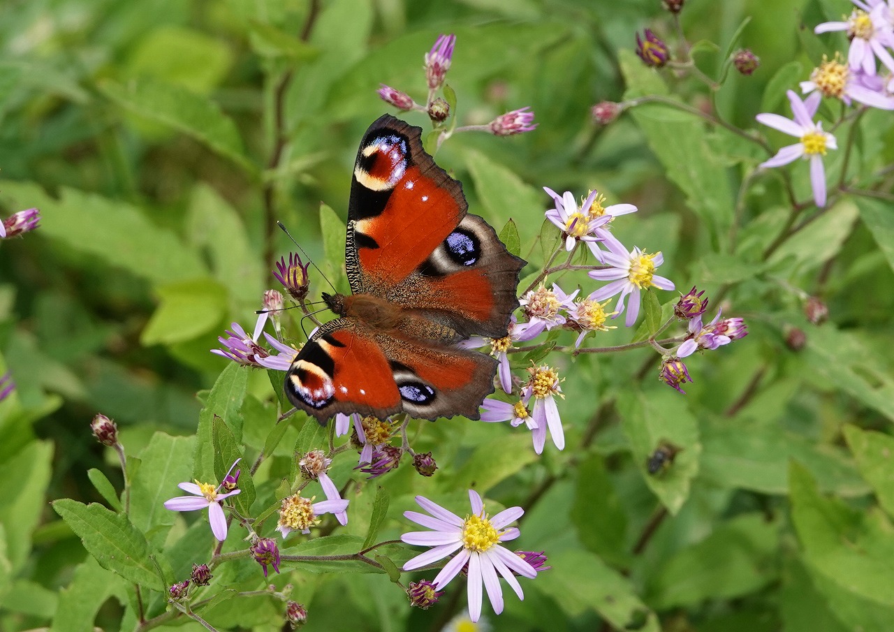 思い出話はさておき、このクジャクチョウは陽が差さないと飛んでくれないし、花にとまってもなかなか後翅の目玉まで見せてくれず前2つで終わることが多い。4つ見えるタイミングを狙ってシャッターを押す。