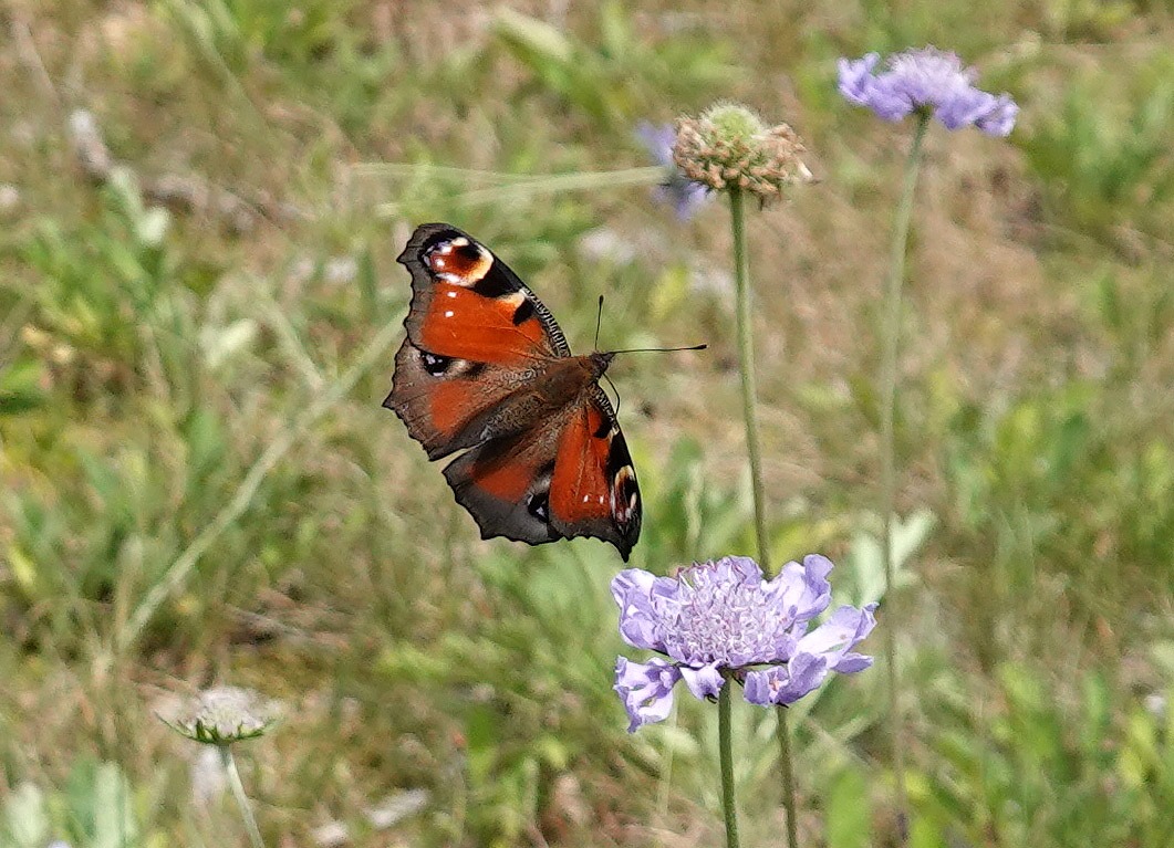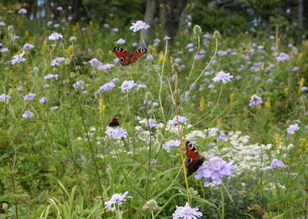 ↓ マツムシソウの群落を飛ぶクジャクチョウ、まさにパラダイス (アーカイブ 2021年8月27日 入笠山)