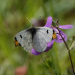 空を舞うクモマツマキチョウ、青空に黄色ならぬオレンジ(ツマキの名は翅の先が黄色いという意)が映えます。訪花の直前、直後は速くないので比較的撮りやすいのですが、普通に飛んでいるところはなかなかピントが合いません。