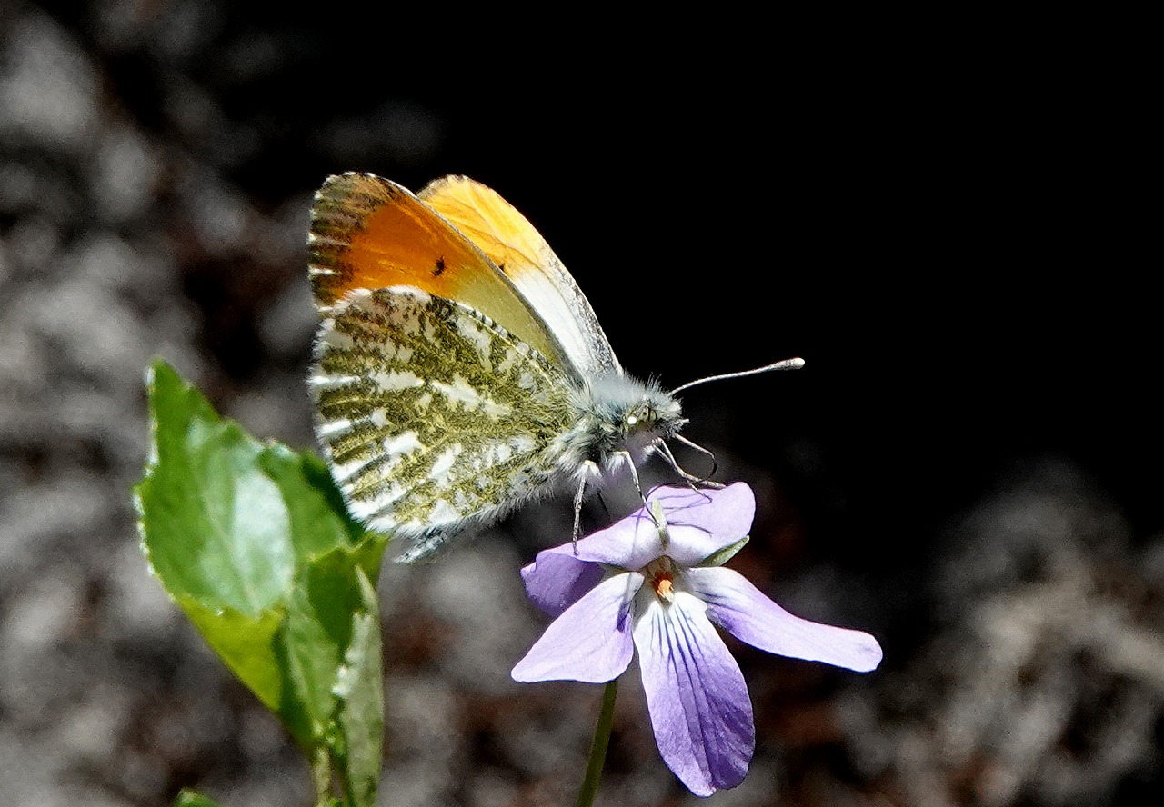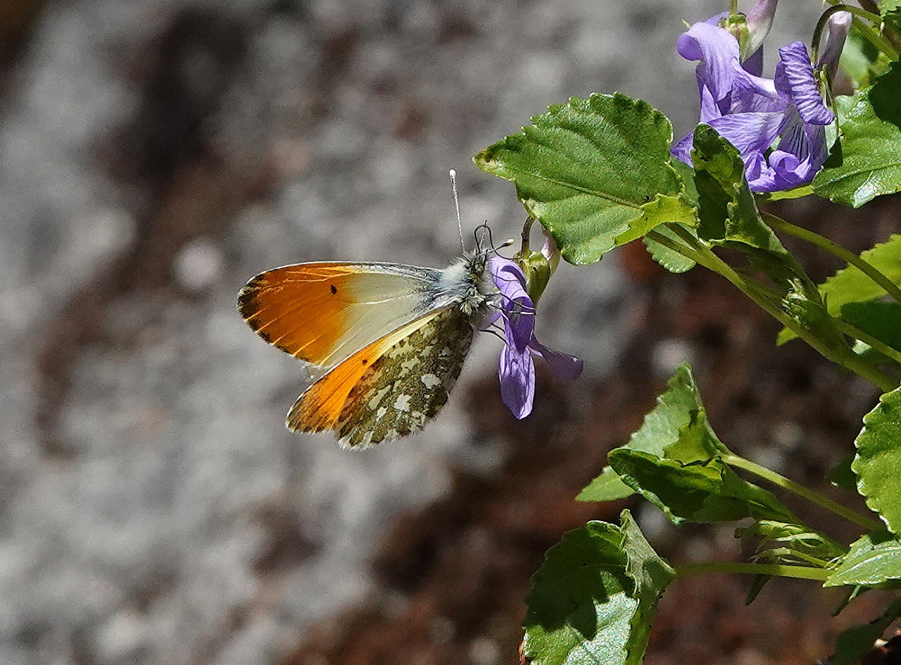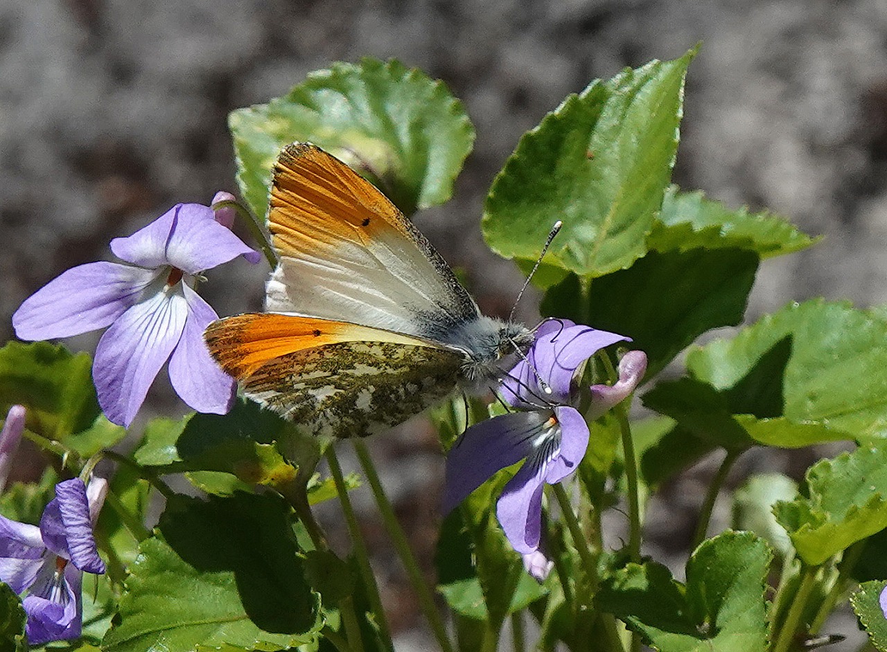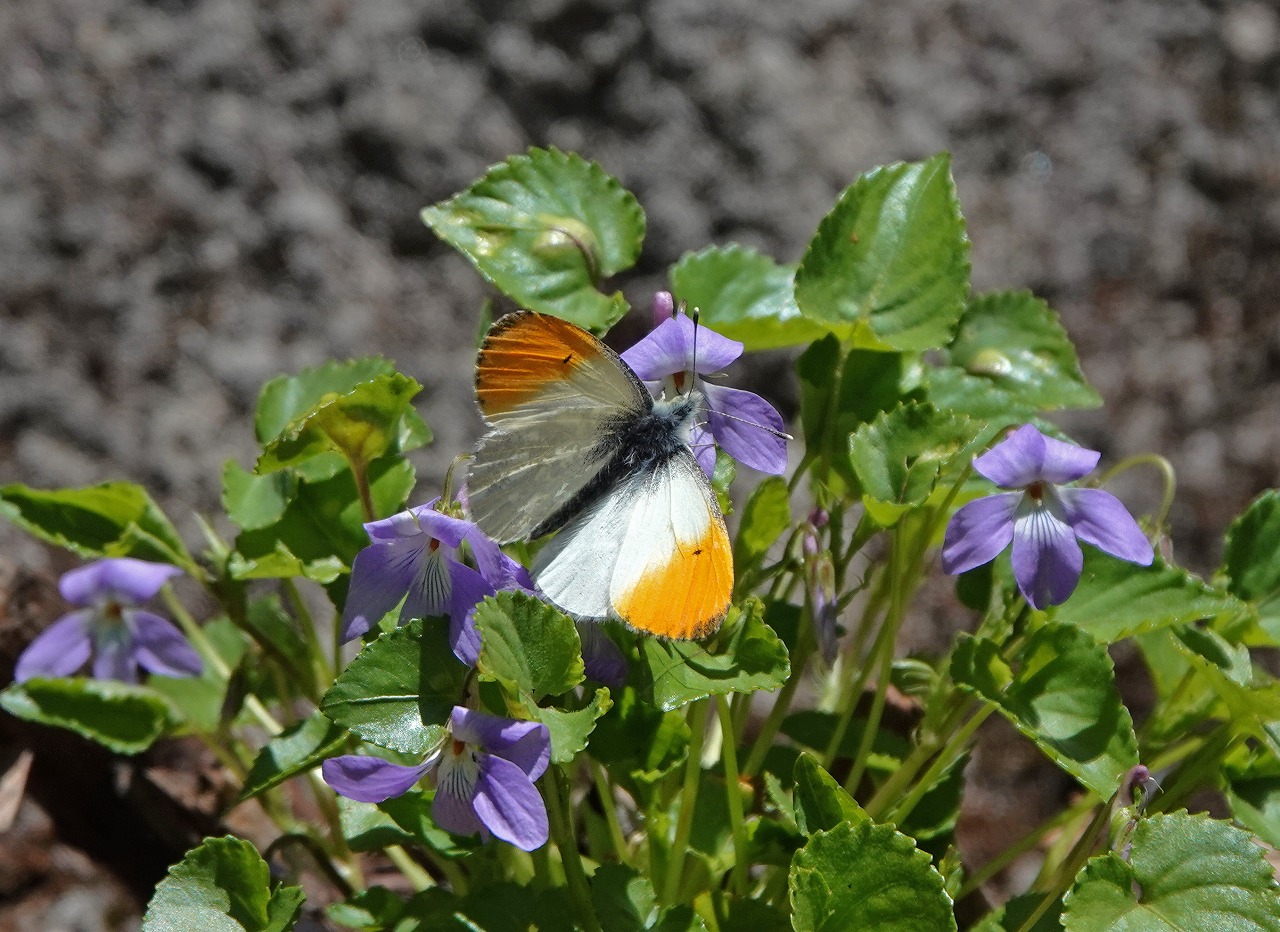 岩の割れ目から芽を出し咲いたスミレで吸蜜するクモマツマキチョウ(オス)。本州では9種生息する高山蝶の一つに数えられる。ただ、緯度が高くなると、例えばフランス中部やベルギーでは、平地にまるでツマキチョウのような感じで飛んでいて驚いたことがある。