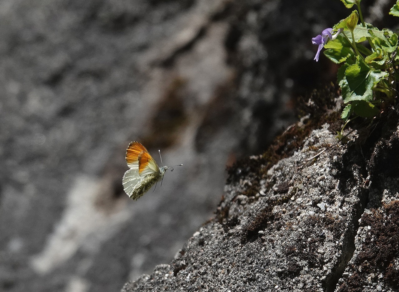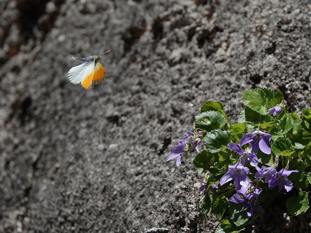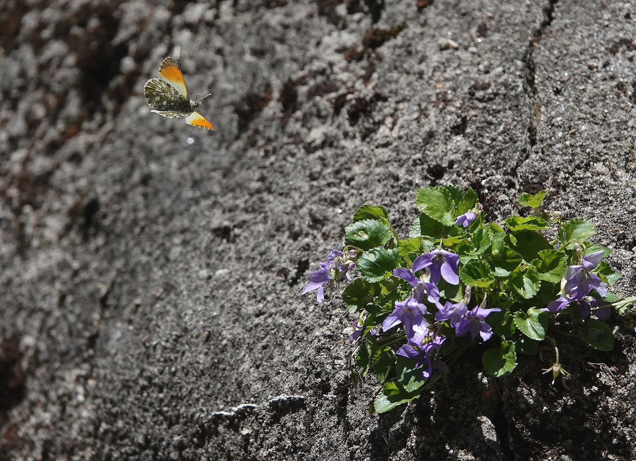 単に移動のための飛翔はあっという間に通り過ぎるのに対して、訪花目的の飛翔は到着点も予想がつくので比較的撮影はしやすい。花に近くづくとともに減速し、ゼンマイ式の口吻が伸びてきてなかなか迫力があって好きなシーンだ。岩の割れ目に根を張り、器用に咲いているスミレはクモツキ(クモマツマキチョウの愛称)のお気に入りのようで一定のコースで何度も飛来してくれたので撮影にあたって心の準備ができラッキーであった。こんなところまでスミレの種を運んでくれたアリンコ(恐らく風で飛ばされたのではないだろう。スミレの種にはアリを惹きつける物質が含まれていて、アリに巣に持って帰ってもらいスミレの繁殖に貢献させているらしい。なんと巧みな・・・)に感謝したくなった。