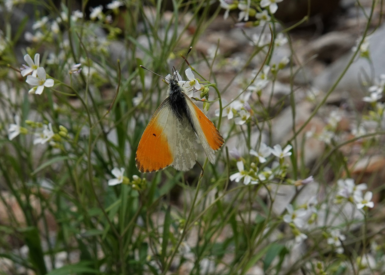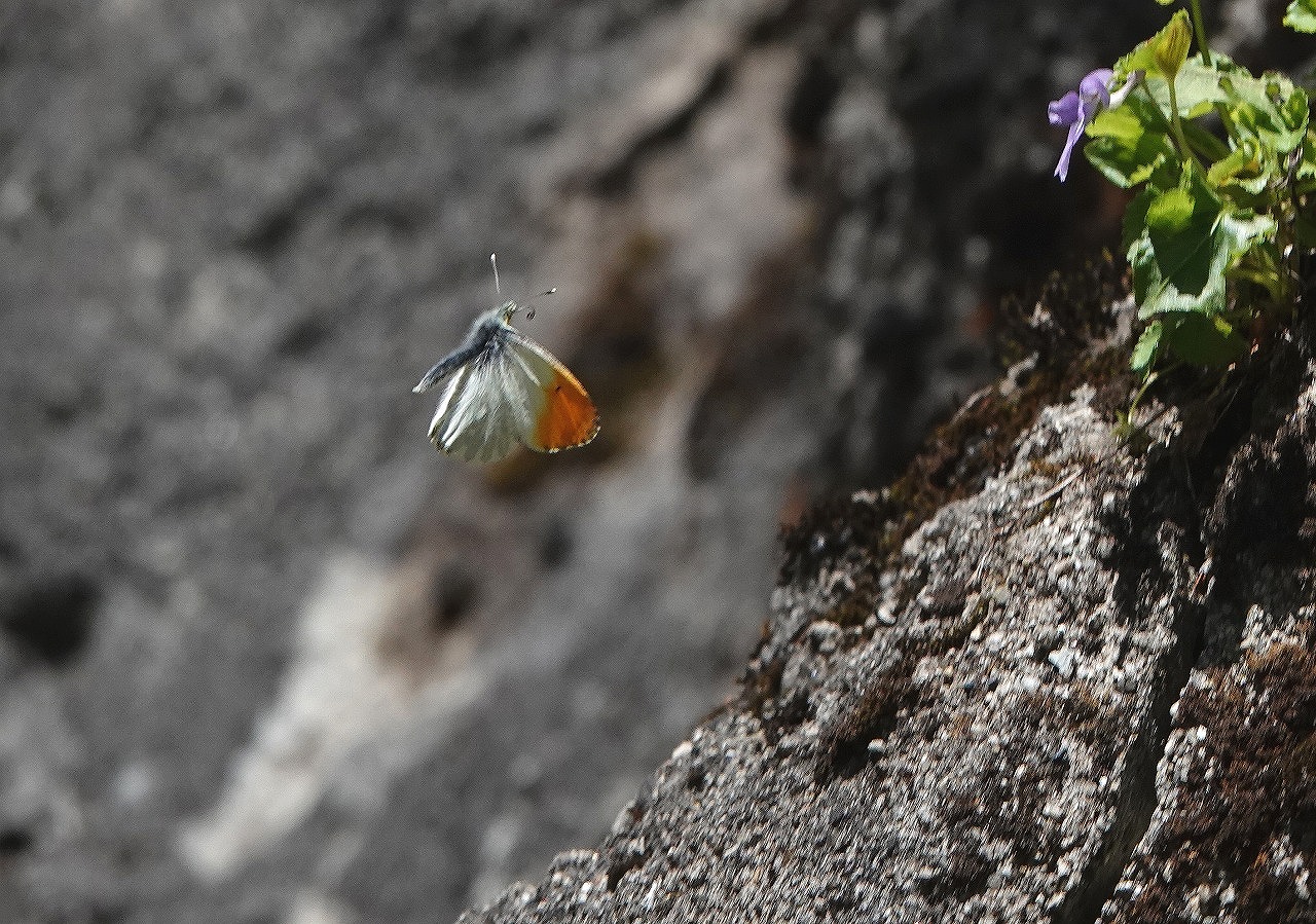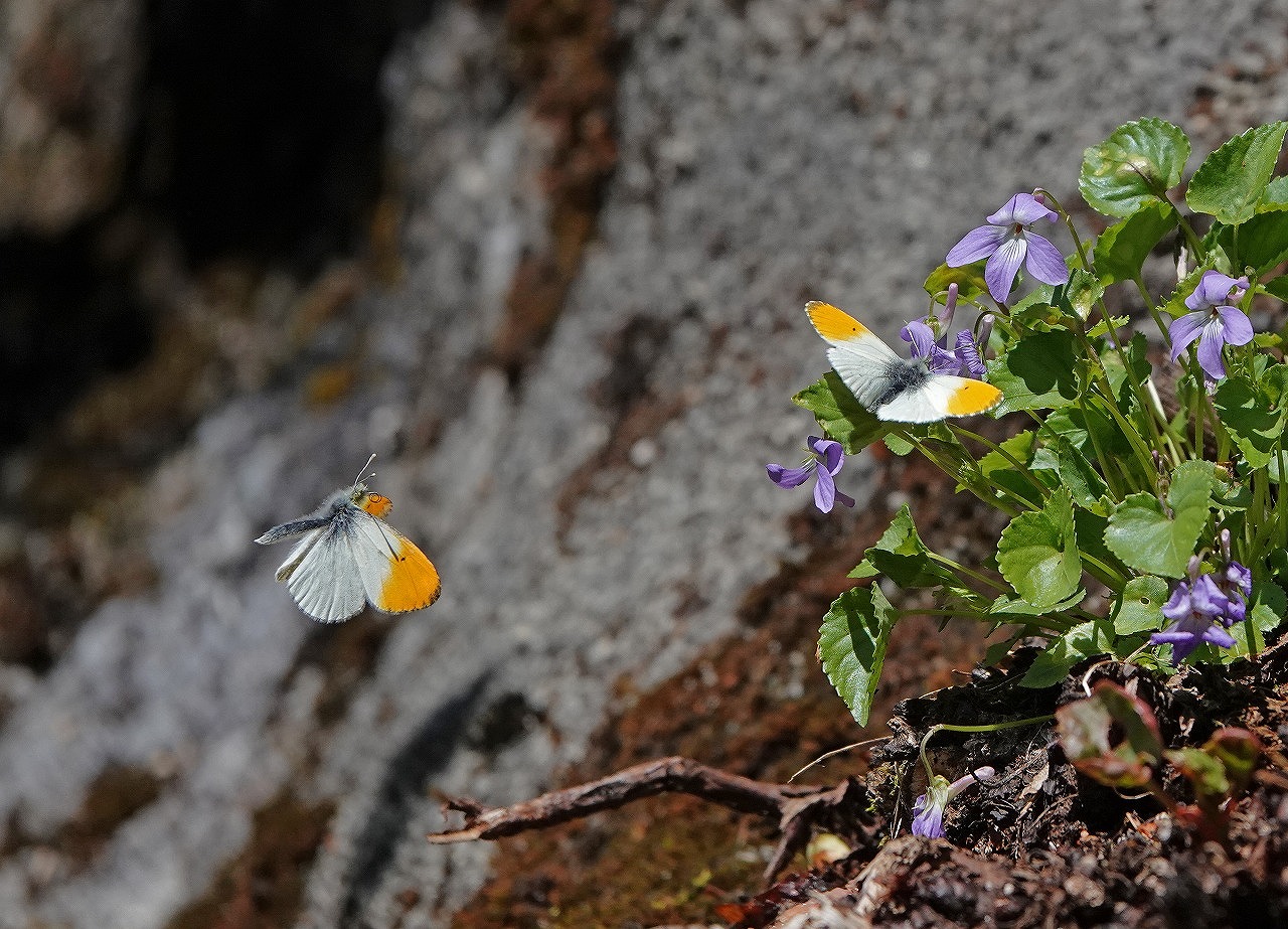 単に移動のための飛翔はあっという間に通り過ぎるのに対して、訪花目的の飛翔は到着点も予想がつくので比較的撮影はしやすい。花に近くづくとともに減速し、ゼンマイ式の口吻が伸びてきてなかなか迫力があって好きなシーンだ。岩の割れ目に根を張り、器用に咲いているスミレはクモツキ(クモマツマキチョウの愛称)のお気に入りのようで一定のコースで何度も飛来してくれたので撮影にあたって心の準備ができラッキーであった。こんなところまでスミレの種を運んでくれたアリンコ(恐らく風で飛ばされたのではないだろう。スミレの種にはアリを惹きつける物質が含まれていて、アリに巣に持って帰ってもらいスミレの繁殖に貢献させているらしい。なんと巧みな・・・)に感謝したくなった。