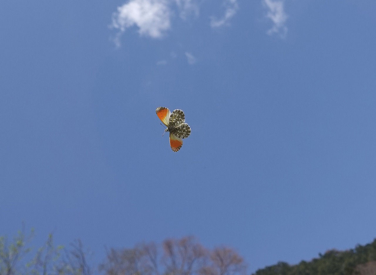 ↓ 2頭もつれる ⇒ 動画(うるさめのBGMは川の流れ) クモマツマキチョウ2頭