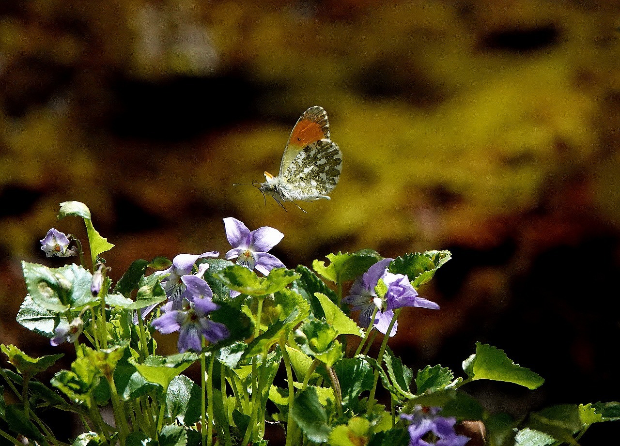 まだ、メスが発生しかけくらいのタイミング(5月14日)であり、食草のミヤマハタザオが咲いていれば好んで飛来するが、まだちらほら咲き出しているくらいであったので訪花の大半はこの時点で咲き誇っているスミレであった。