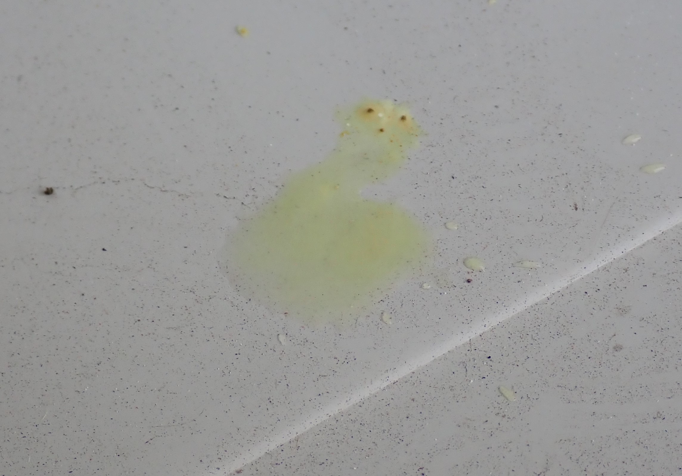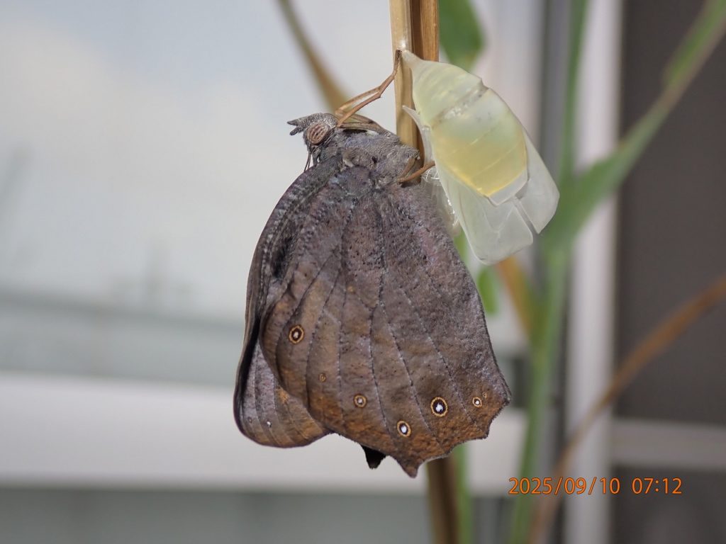 今回分かったことは、翅を完全に伸ばし切ると、最後に体を軽くするためもあり体の中の余分な水分をオシッコのように排泄するわけだが、チョウの種類でその色が異なる。クロコノマチョウのものは黄色だった。因みに、アカタテハなどは思わずドキッとする血のような真赤なものを出す。幼虫時代の体が蛹という殻の中で一旦ドロドロに溶けて、その後チョウの体として再構成されるわけだが、その際不要なものはたったこれだけだったということだ。その無駄の無さには感心させられる。