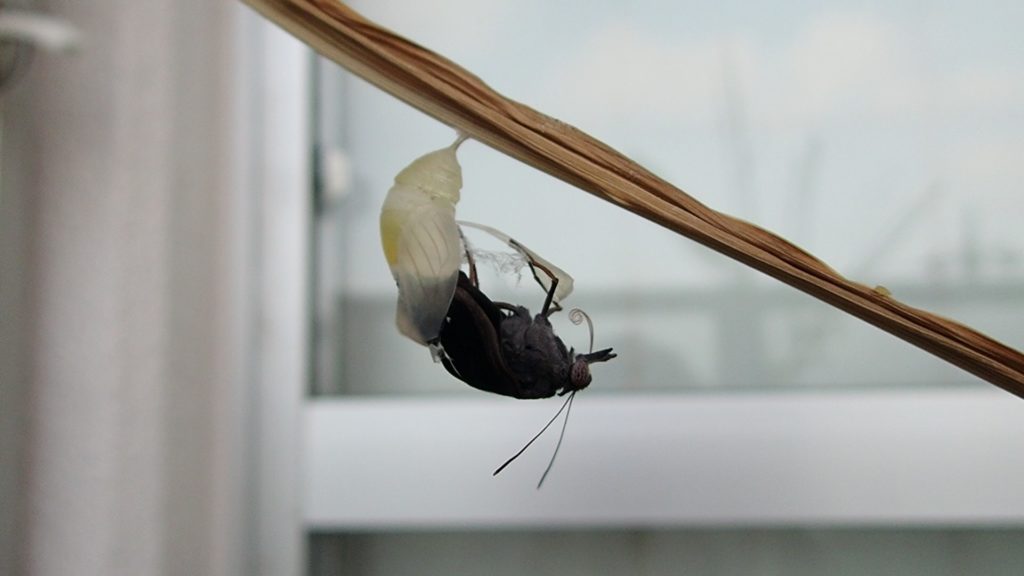 殻に割れ目が入ってから、チョウの体が完全に殻から抜け出るのには僅か40秒程度、さらに翅を伸ばすために安定した姿勢を取るまでにも1分しかかからない。その後、翅が完全に伸びて飛べるようになるまでには数時間かかるものが多いが、今回のケースでは、意外と早く約2時間ほどで飛び立って行った。