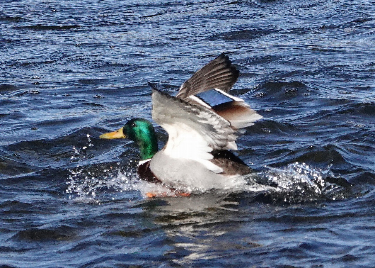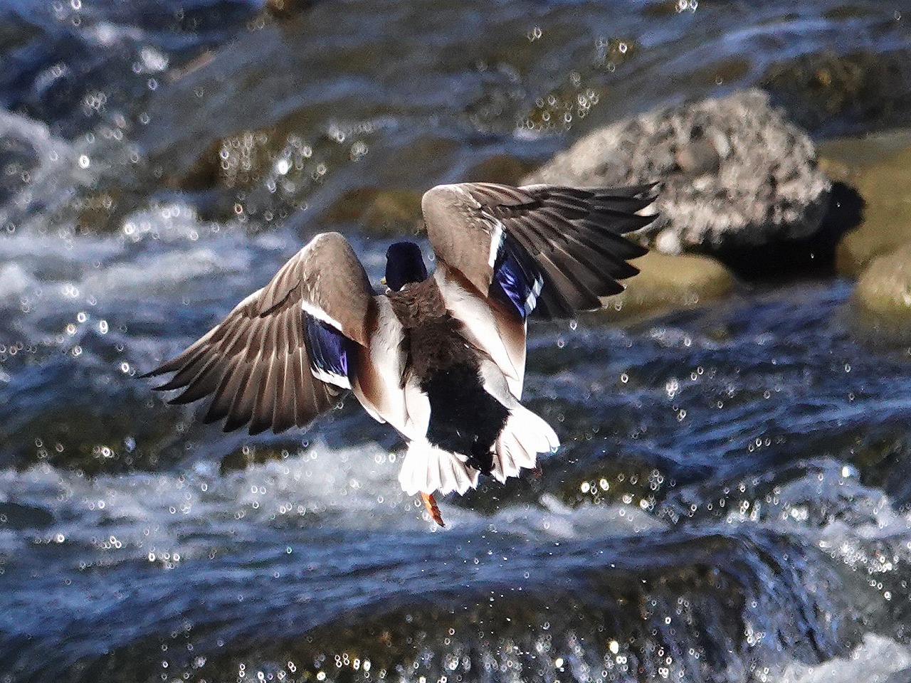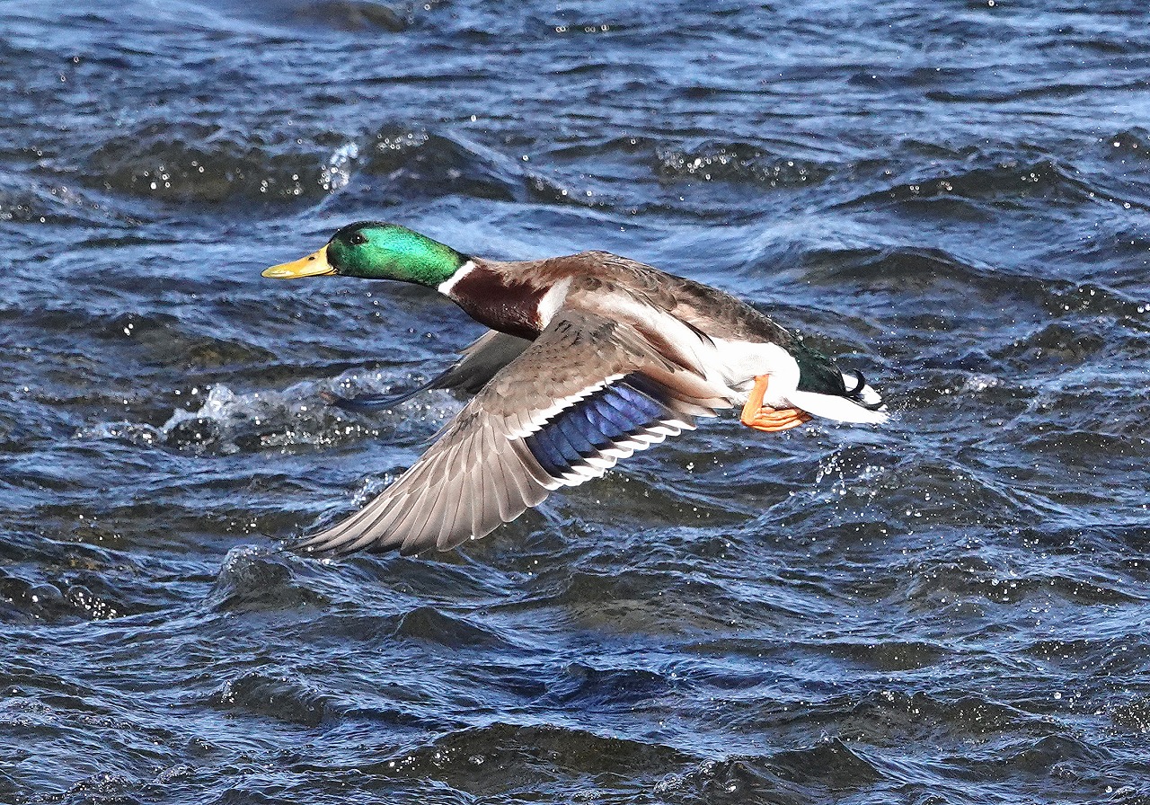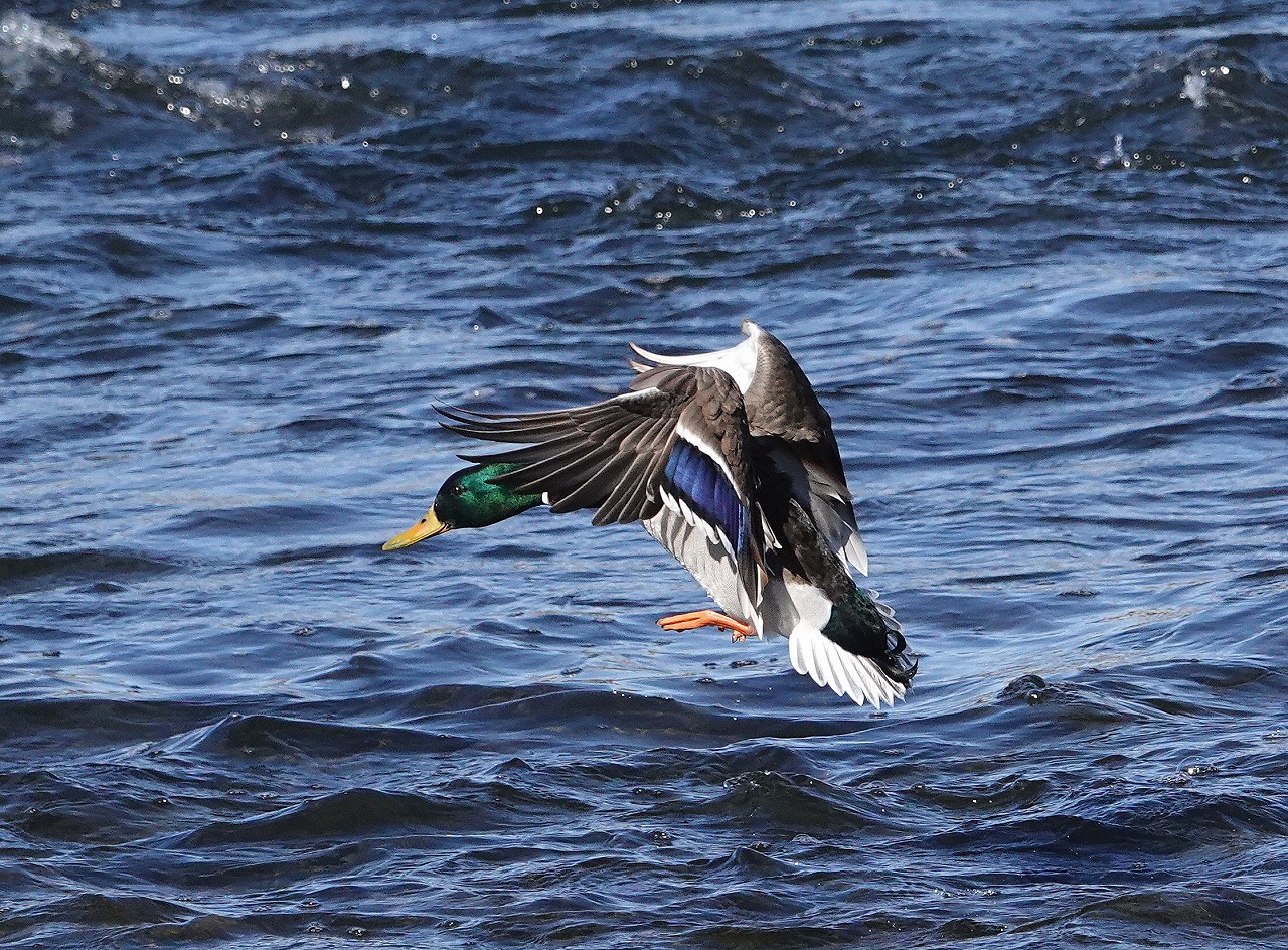 オスの飛翔。頭の緑と翼鏡(正確には次列風切の一部)の紫は共に構造色であり見る角度によって頭は紫になるし、翼鏡も黒になる。これに対して嘴の黄色、脚の橙色は角度に関係なく見え方は変わらない。翼鏡の色はカモの種類によって異なり、渡りの際の仲間の識別に役立っているらしい。
