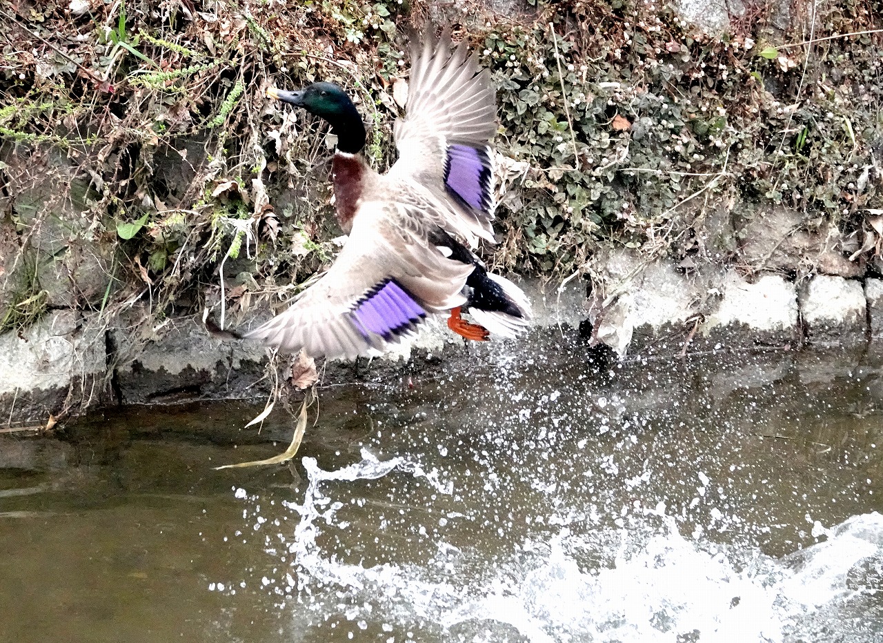 ↓ マルガモ(マガモとカルガモのハイブリッド)の翼鏡は薄紫 (アーカイブ 2021年2月17日 二ヶ領用水)