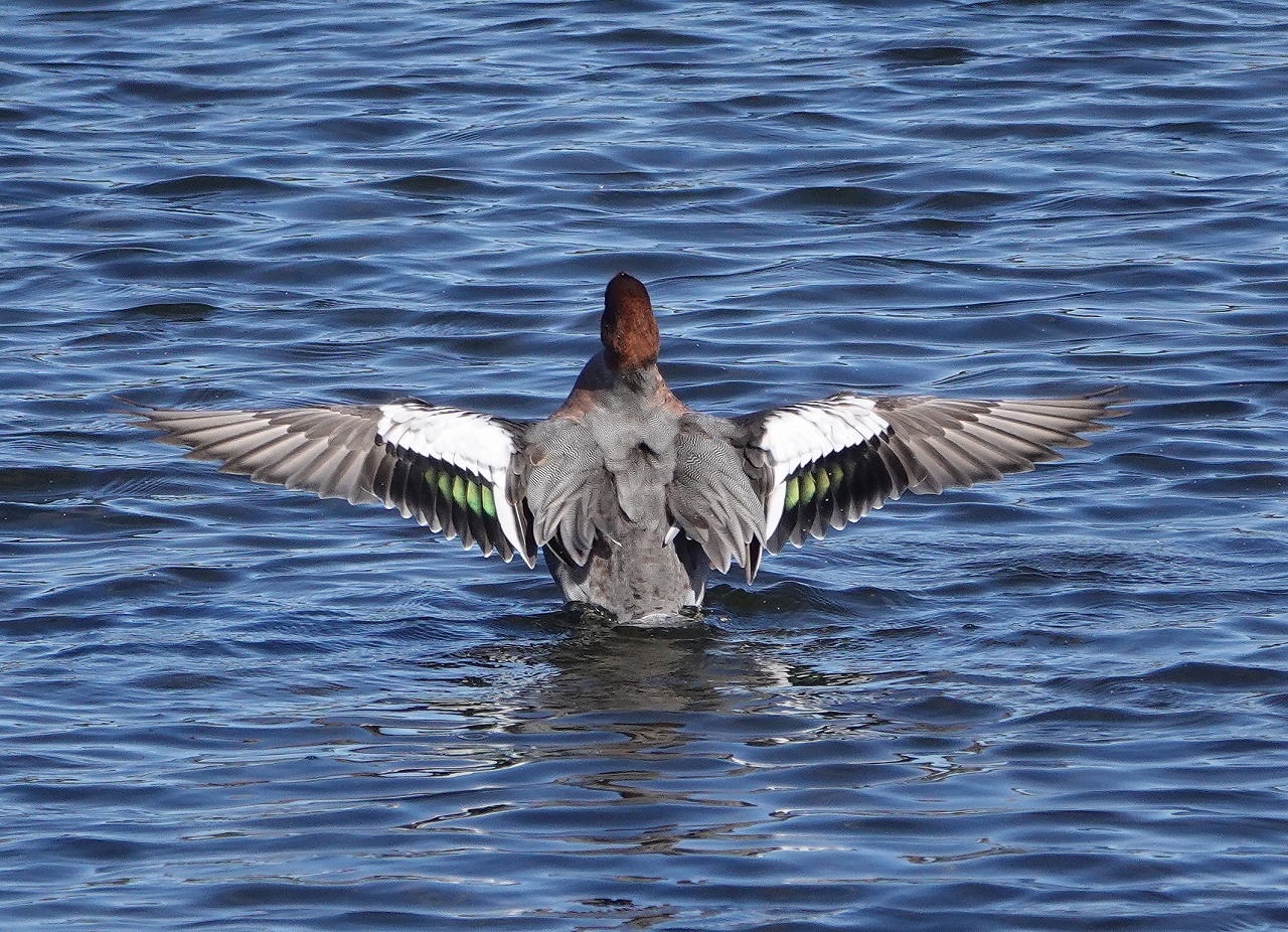 ↓ ヒドリガモの翼鏡は鈍い黄緑 (アーカイブ 2024年12月9日 宿河原堰)