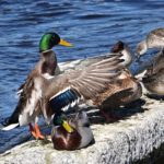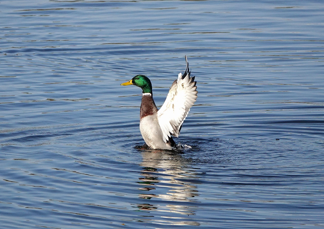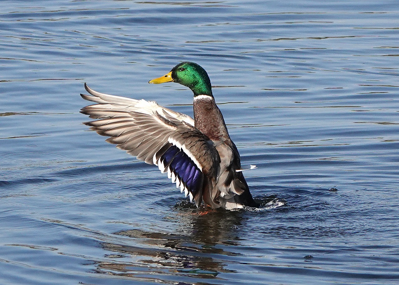 マガモのオスが水上に伸びあがってパタパタのデモンストレーションをやっている。紫の部分が翼鏡でこのエクササイズをやってるとき、飛んでるとき、あるいは羽繕いで見せることがあるくらいで普段はほとんど見えない。いずれも宿河原堰での一コマ。