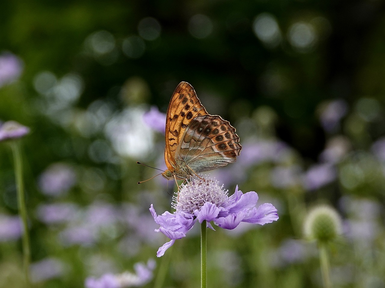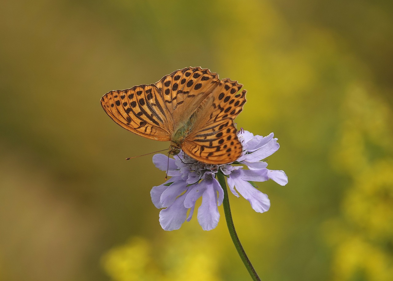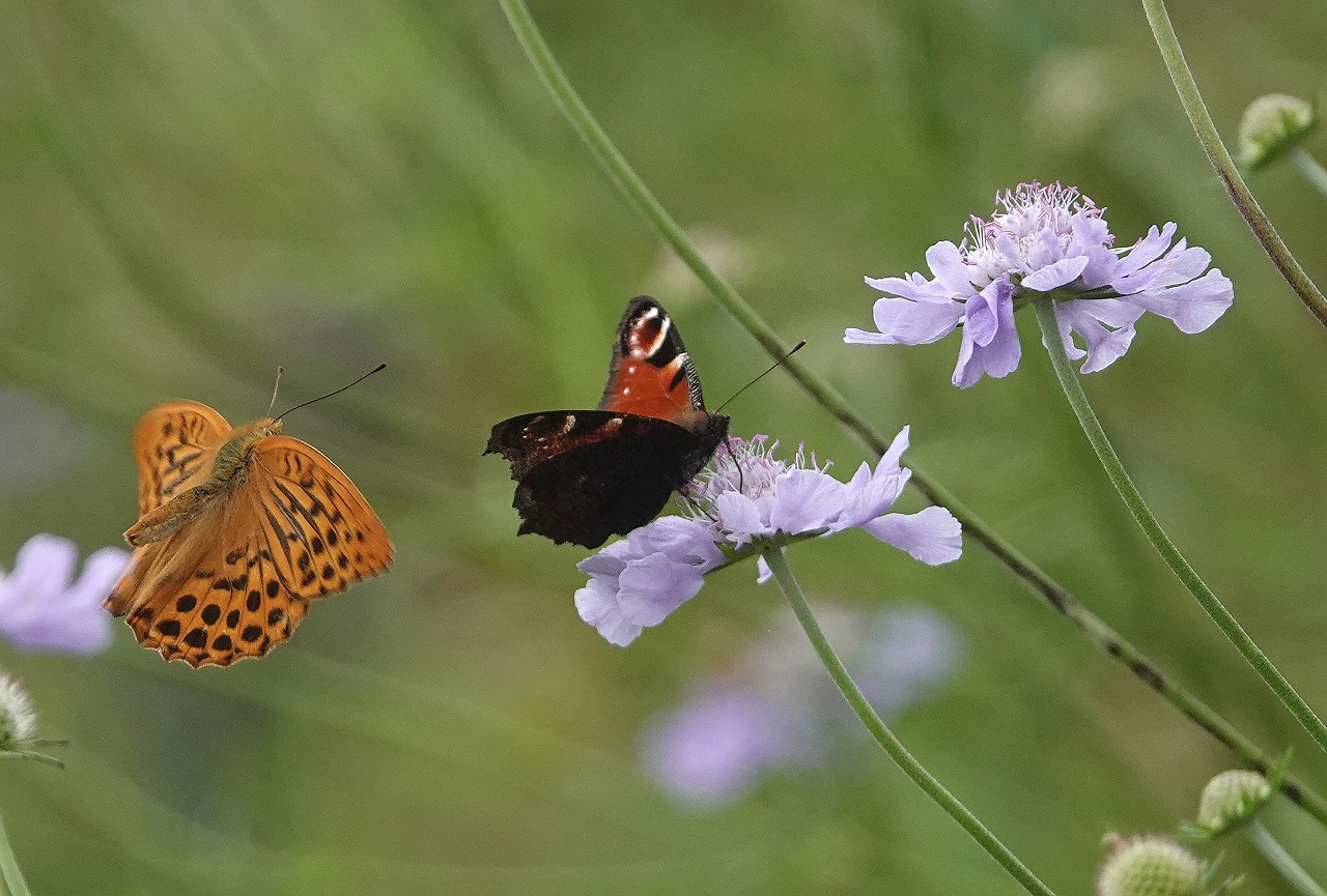 今回はミドリヒョウモンがやたらに多かった。薄紫のマツムシソウはどの蝶にも好まれているようであれやこれや飛来、吸蜜するので撮影する方としても楽しめる。蝶も花もあと一週間早ければもう少しいい状態だったかも知れないがこのあたりは難しい。