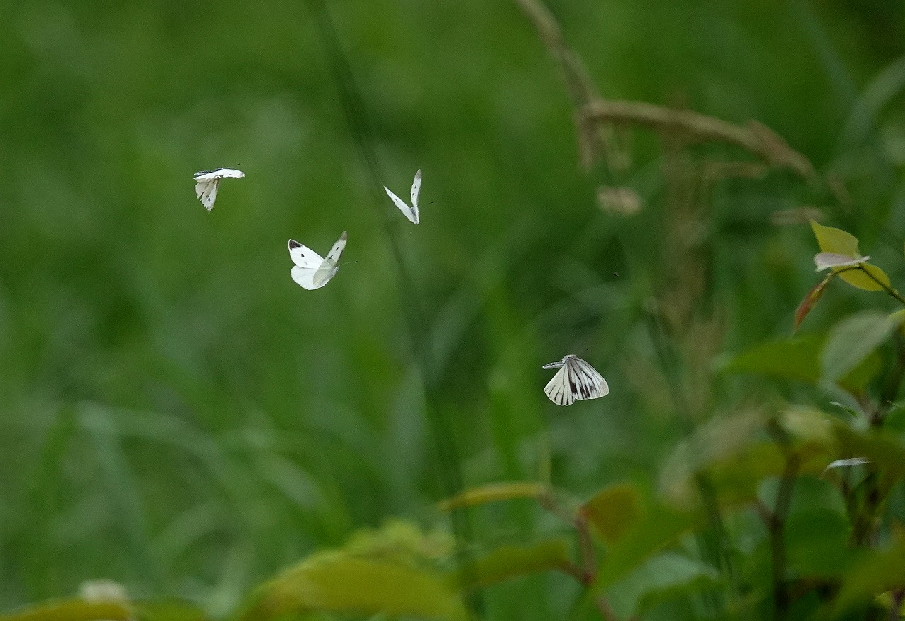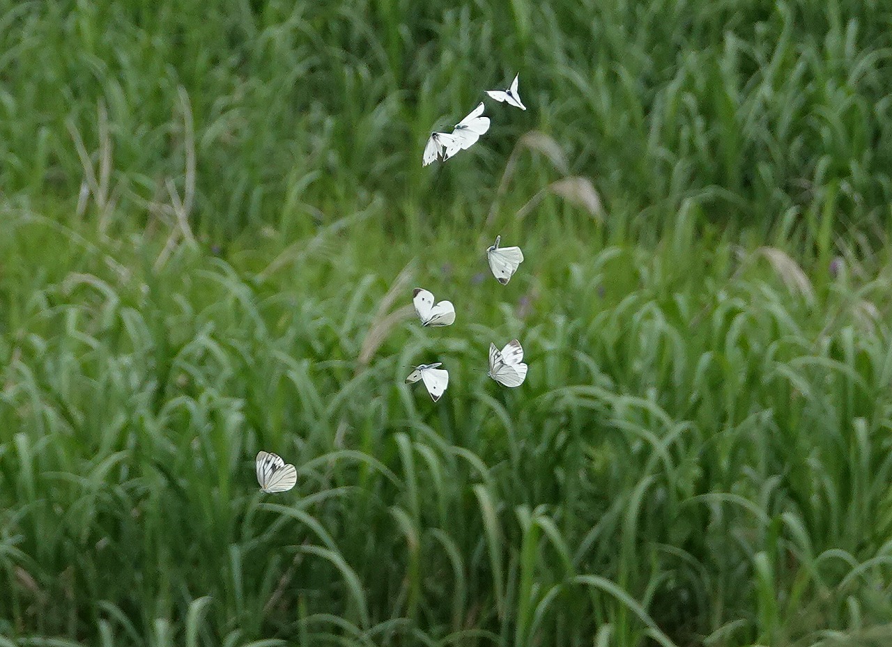 ↓ 時折、モンシロチョウが集団になって群飛するのを見かけるがこれなどまだまだ可愛い集団。群飛現象がおこる時は集団の中にメスがいるか、或いはスジグロシロチョウが混じっているといわれている。一番右がスジグロシロチョウなので後者のケースだろう