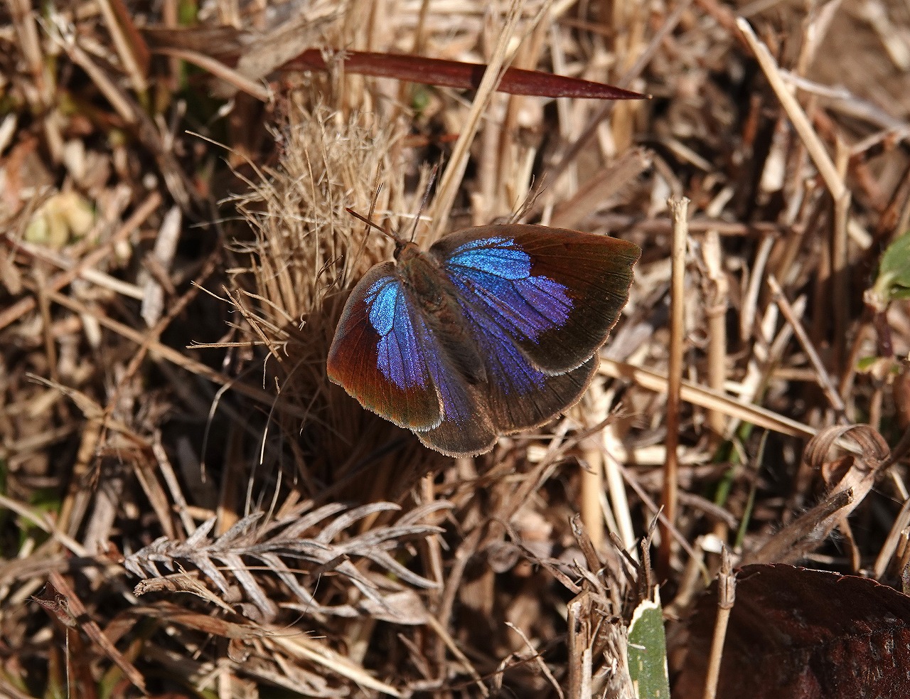 選挙の週末は大寒波だそうだが、まだ今日のところは陽ざしもあって暖かい。目当ての青い鳥、ルリビタキが見られるかもしれないポイントを目指して公園内を歩いていると、小径の斜面から青紫に輝く反射が目に入った。あっ、ムラサキシジミ! 成虫の蝶で越冬するのだが暖かい日には時折、冬眠している葉陰からフラフラと飛び出して、冷えた体温を上げるためか開翅して日光浴をする。最近、白金の自然教育園で同じ場面に出くわし、撮影にもたつき逃げられてしまったので、今度こそ、と慎重に近づき撮影できた。満足、蝶の撮影は久しぶり!