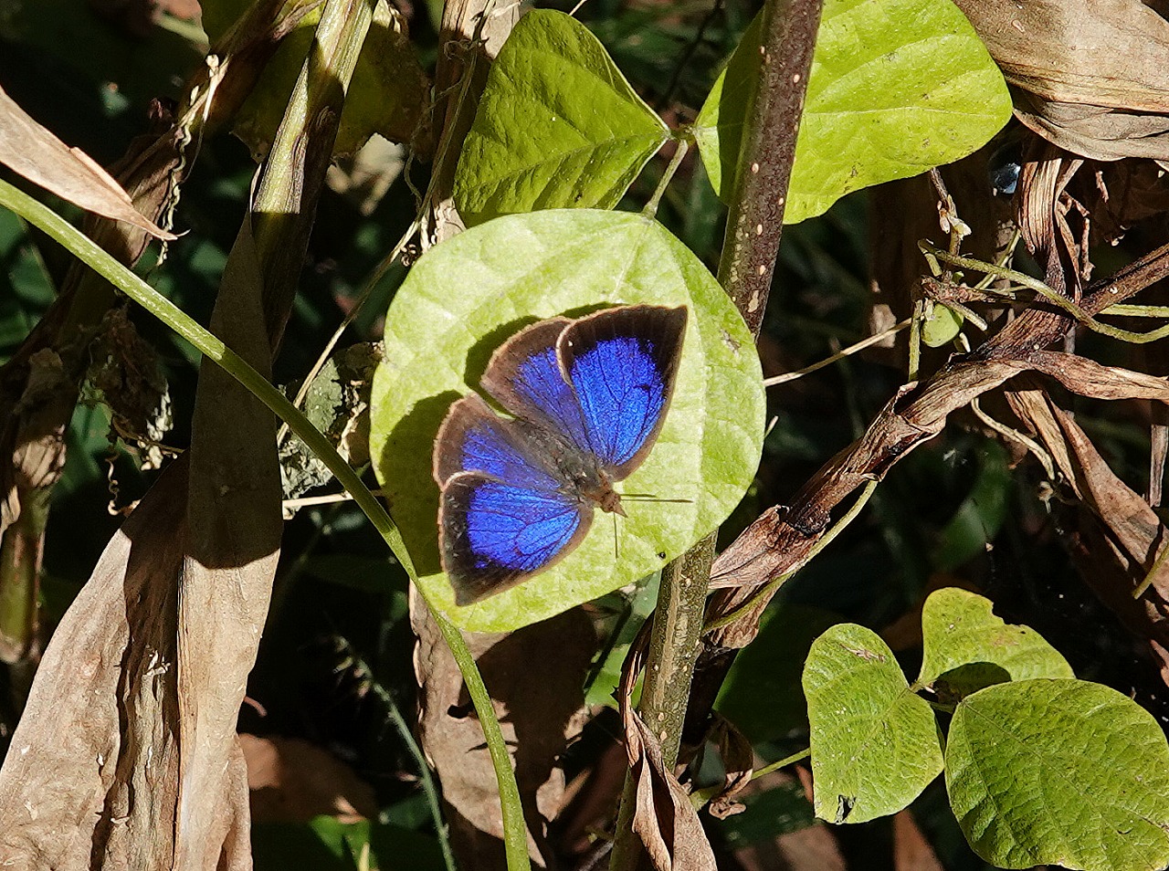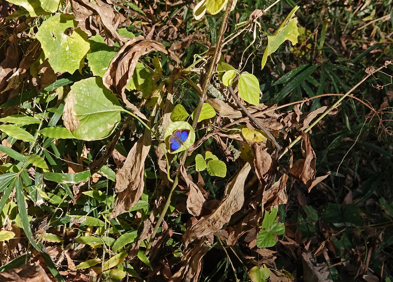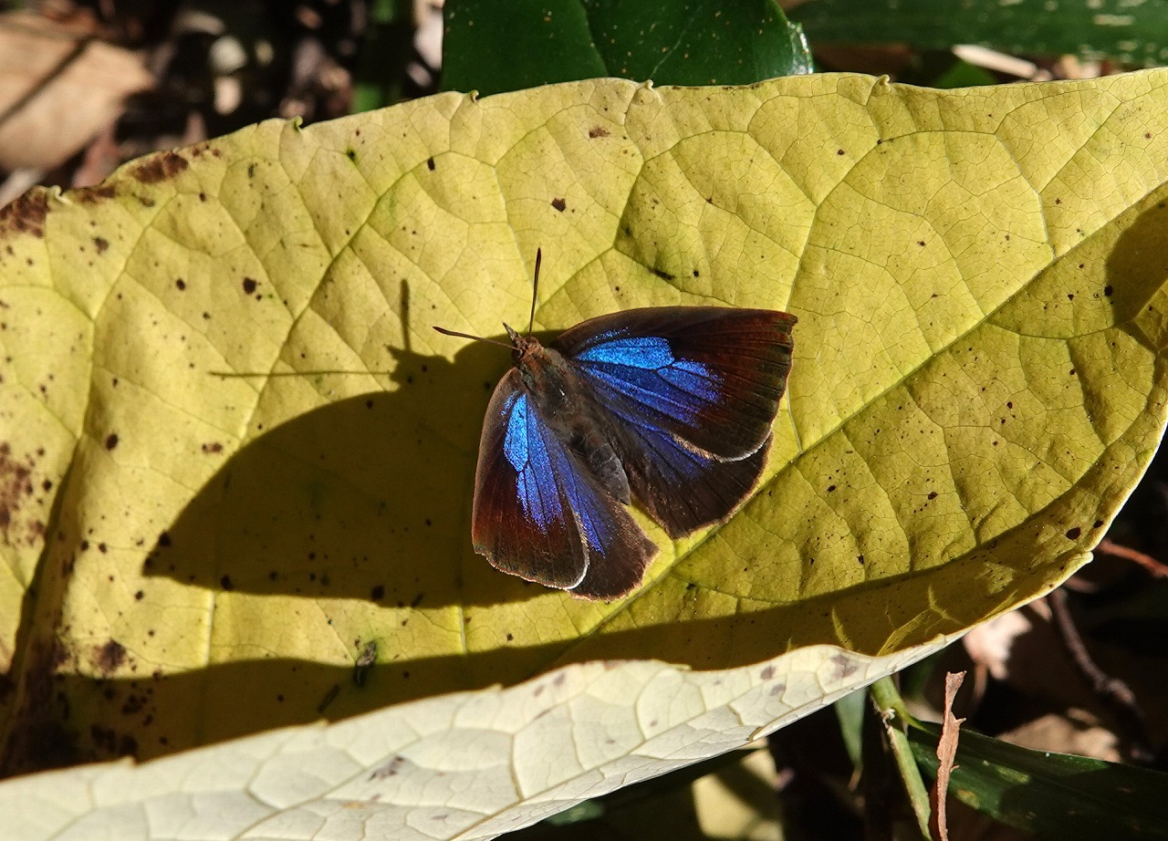 遠くからも一際目立つ青紫色の輝きは開翅して日光浴しているムラサキシジミ(♂)。蝶は期待できず、鳥も見かけず殺風景にも思えた森林公園、そんなかでなんと貴重なこの輝き! 得したような気分で丸一日を過ごす・・・オメデトー!