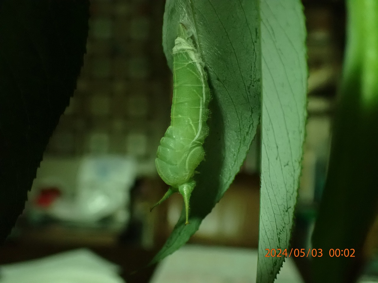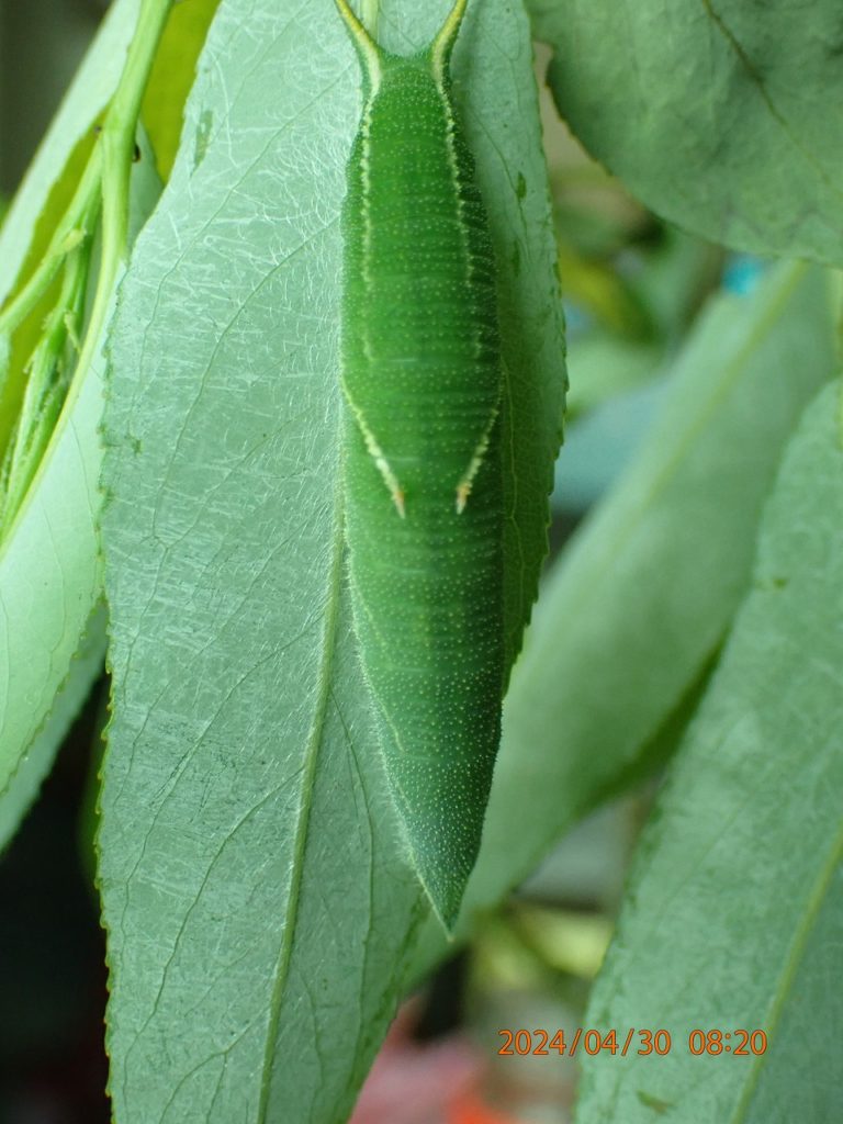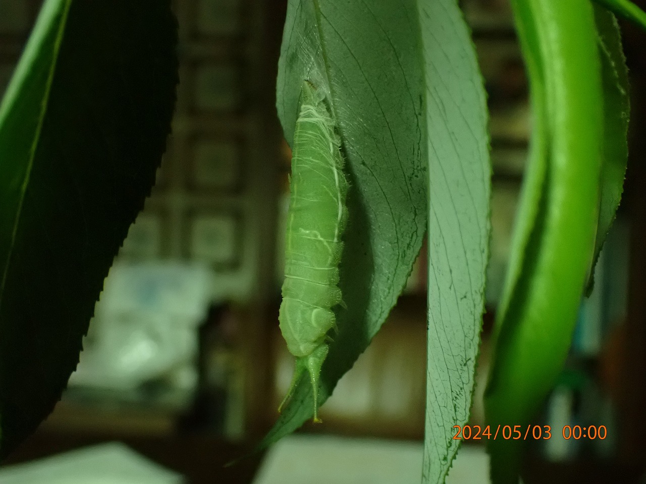 | 食樹であるヤナギの葉で、最終齢が蛹になる場所を決めた。ここに尻を固定するつもりのようだ。↓ | 体を葉っぱに固定して5月1日に前蛹となり、早くもその翌日には、もう頭部に変化が出始めている。↓ | それまで葉っぱを掴んでいた6本の胸脚を葉っぱから完全に離し、いよいよ最後の脱皮が始まった瞬間。↓ |