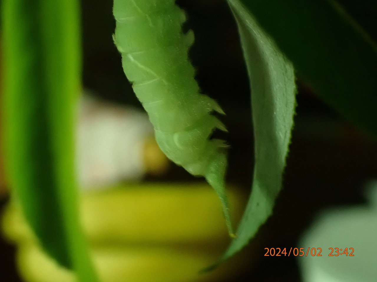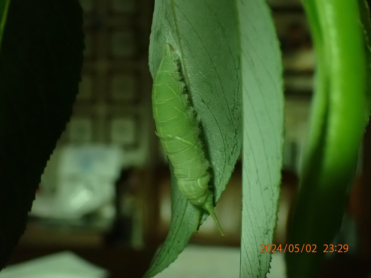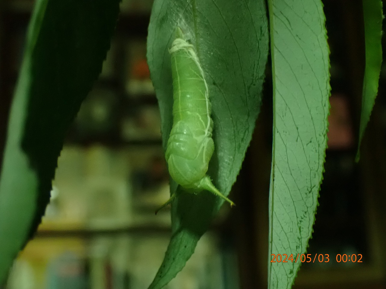 | 食樹であるヤナギの葉で、最終齢が蛹になる場所を決めた。ここに尻を固定するつもりのようだ。↓ | 体を葉っぱに固定して5月1日に前蛹となり、早くもその翌日には、もう頭部に変化が出始めている。↓ | それまで葉っぱを掴んでいた6本の胸脚を葉っぱから完全に離し、いよいよ最後の脱皮が始まった瞬間。↓ |