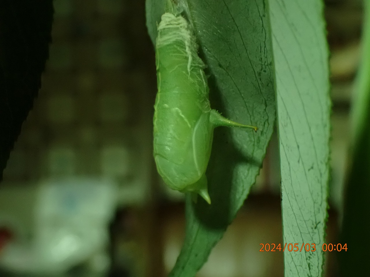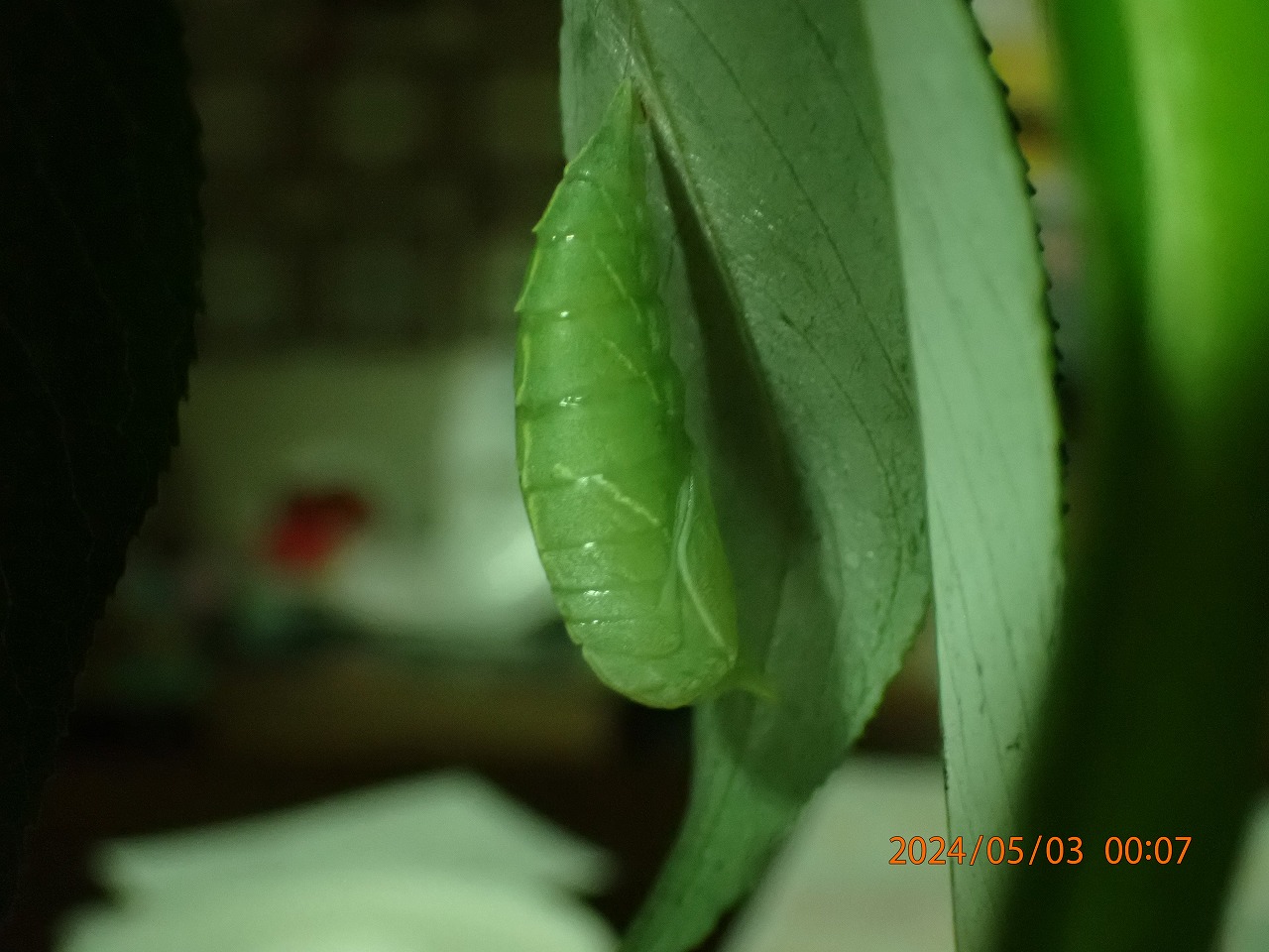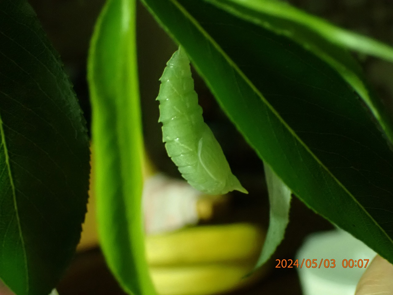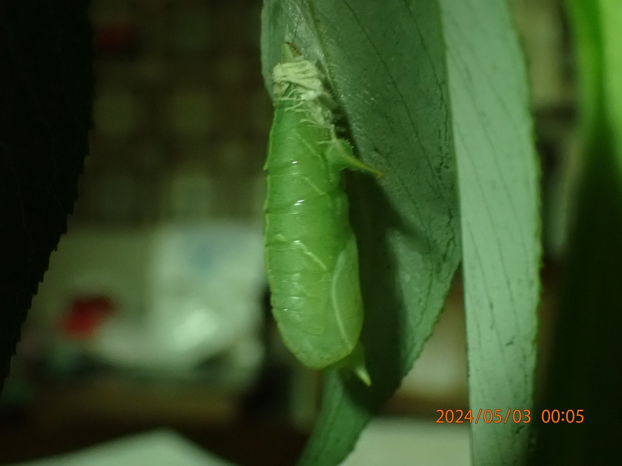 これまで少年時代のモンシロチョウの飼育から始まっていろいろなチョウの飼育をしてきた。しかし、最終齢の幼虫がどのように蛹に変身するか、その瞬間にはなかなかタイミングよく立ち合えていなかった。もちろん、四六時中見張っていればその瞬間は見られるわけだが、現実にはなかなかそうはいかなかったということだ。いつも気が付いたら蛹になっていて、脱ぎ捨てた最終齢時代の皮は小さく丸まって落ちていた。