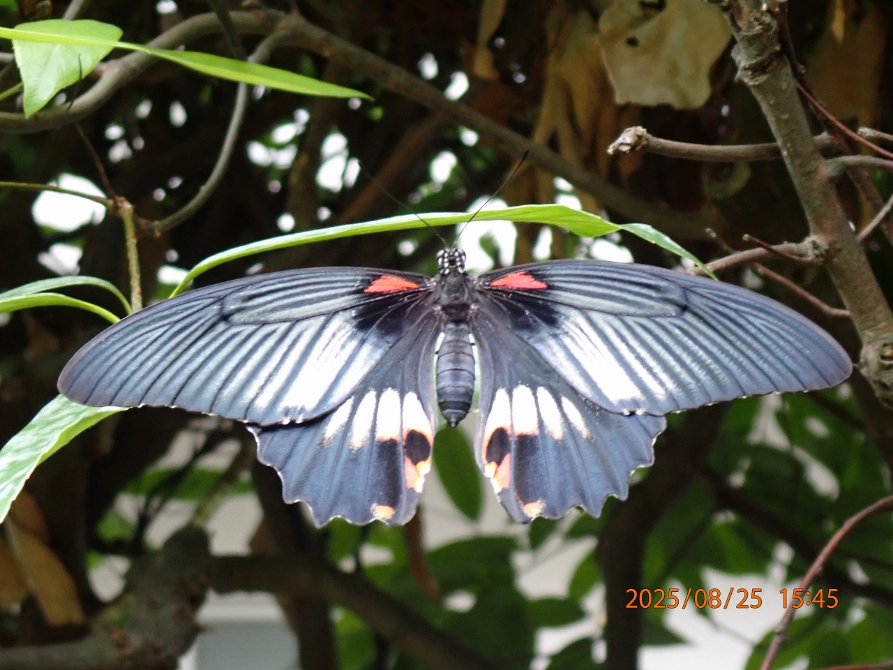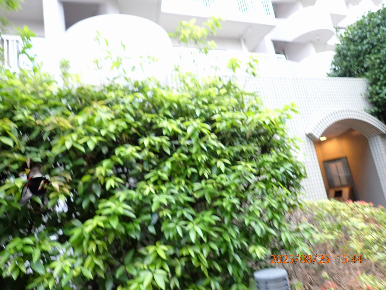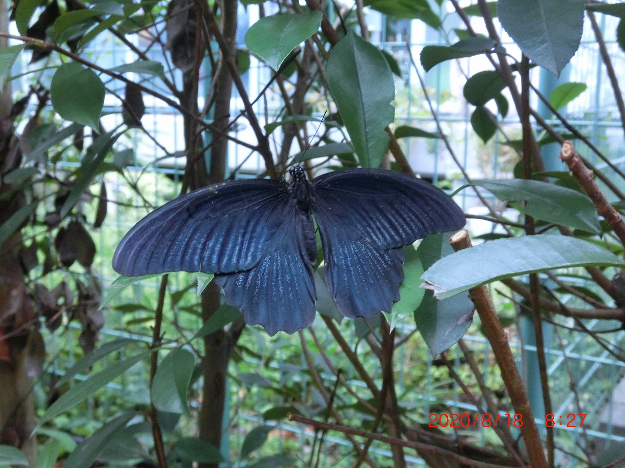 その日、午後4時近くなってもまだ外は暑いが用事があったので止む無く外に出た。30mほど先を黒いチョウが飛んでいるのが目に入ったので、我が家からたくさん巣立って行ったジャコウアゲハだろうかと思ったが、少し近づくとそうではないことが分かった。久しぶりに見るナガサキアゲハだった。アラカシの垣根のあたりを悠々と飛び回っている。間に合わぬかもしれぬが、だめもとですぐにカメラを取りに戻り、用事は取りあえず横に置いて、そのあたりをしばらく探していると、まだ同じような所を飛んでいる。そして最後に、アラカシの葉に止まった。見ると羽化直後かとも思えるほどの新鮮なメスだ。そう言えば何年か前にも、アラカシに止まるナガサキアゲハ(この時はオスだったが)を撮ったことを思い出した。それは2020年、5年前のやはり真夏だった。私が住んでいる近辺には柑橘系の樹木はないが、何軒かのお宅ではベランダで柑橘類を鉢植えで育てておられるので、もしかするとそこでの発生だろうか、それとも遠くから飛来したのだろうか。止まる前に飛んでいるところをカメラで追いかけたが、どうもうまく撮れない。画面の左端にかろうじてそれらしい姿が見えるだけ。