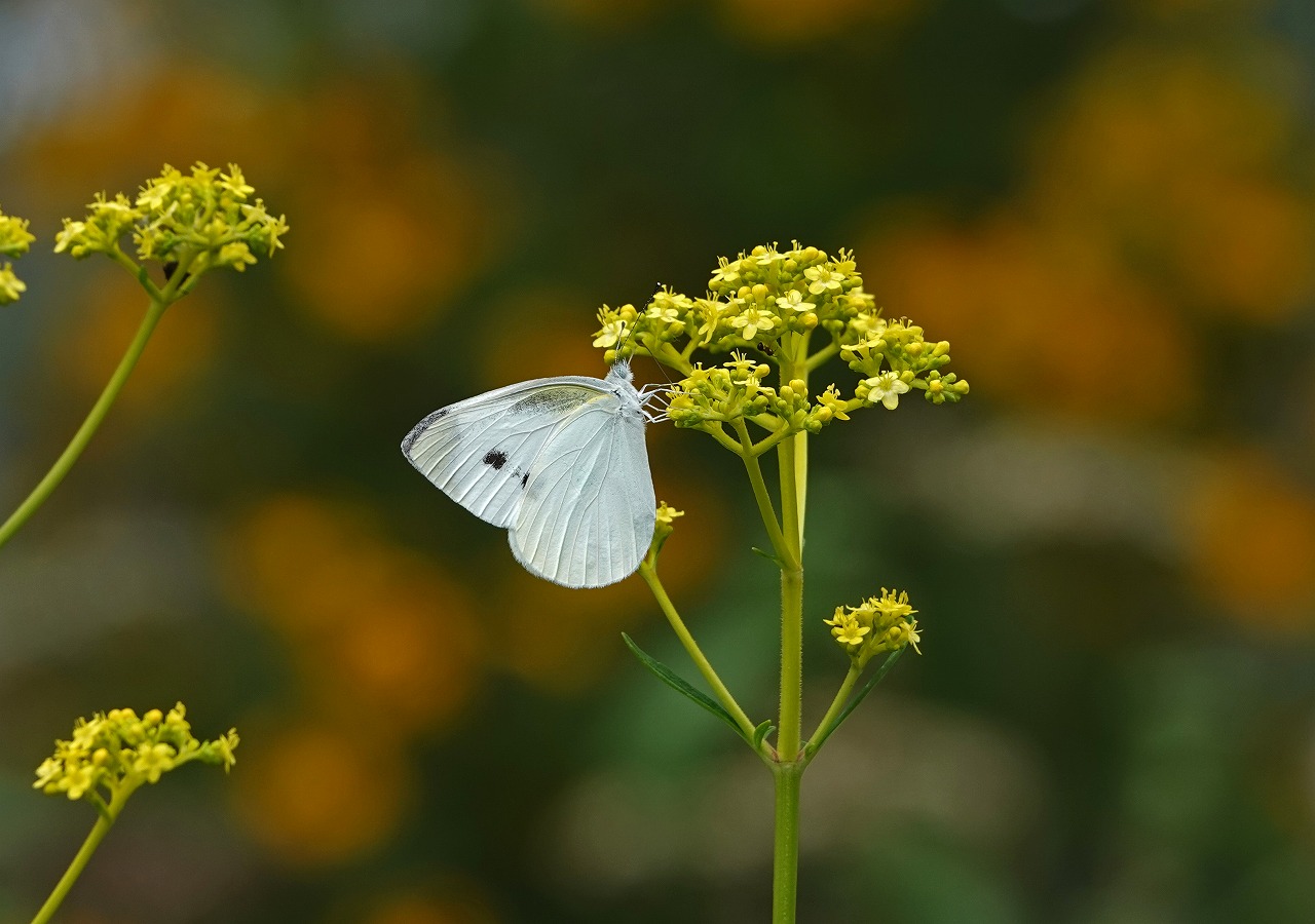 ↓ 花壇にモンシロチョウが飛来。オミナエシ?園芸植物につき名前不詳
