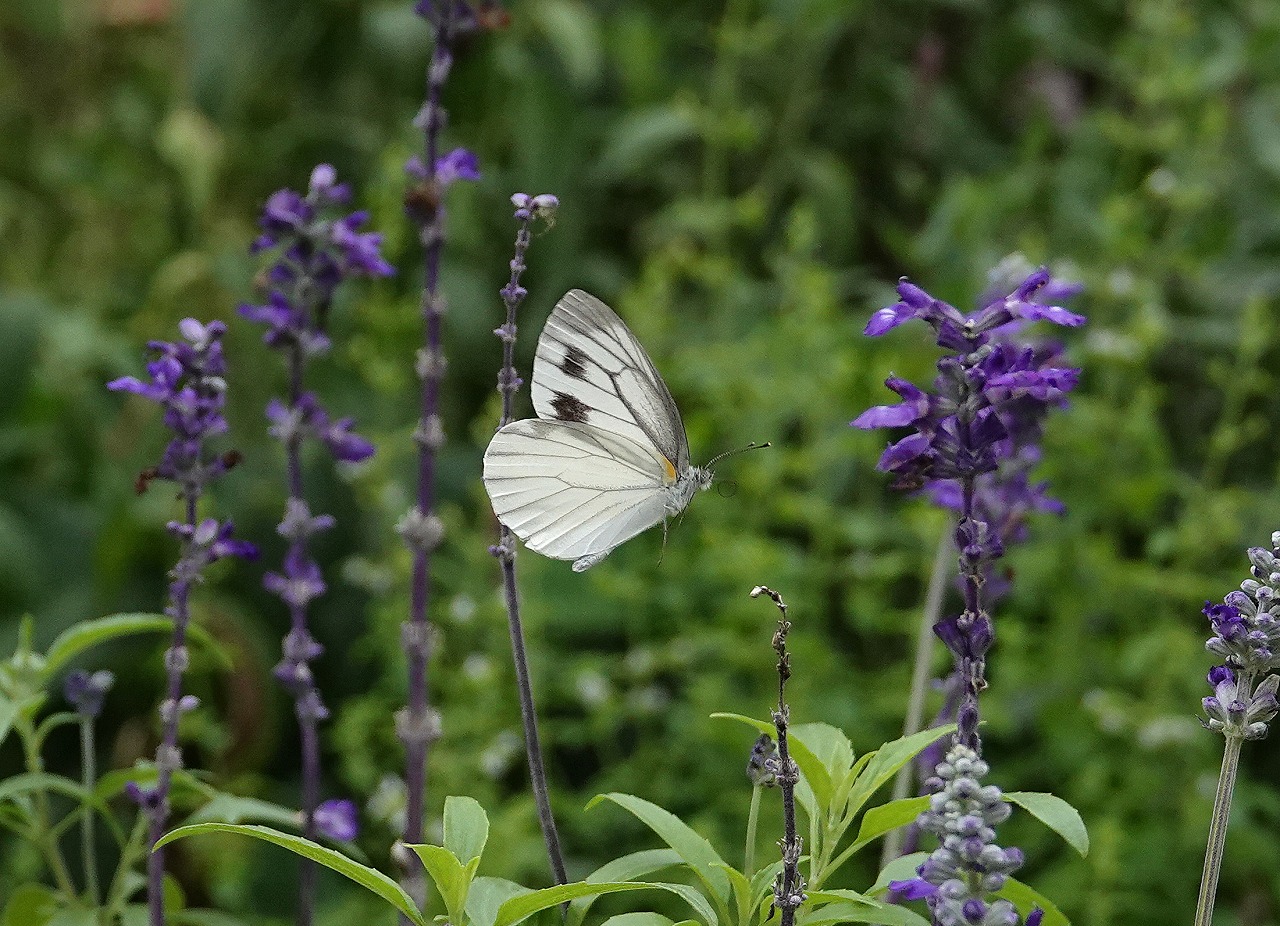 ↓ スジグロシロチョウ。花はコニファー? 同上園芸植物