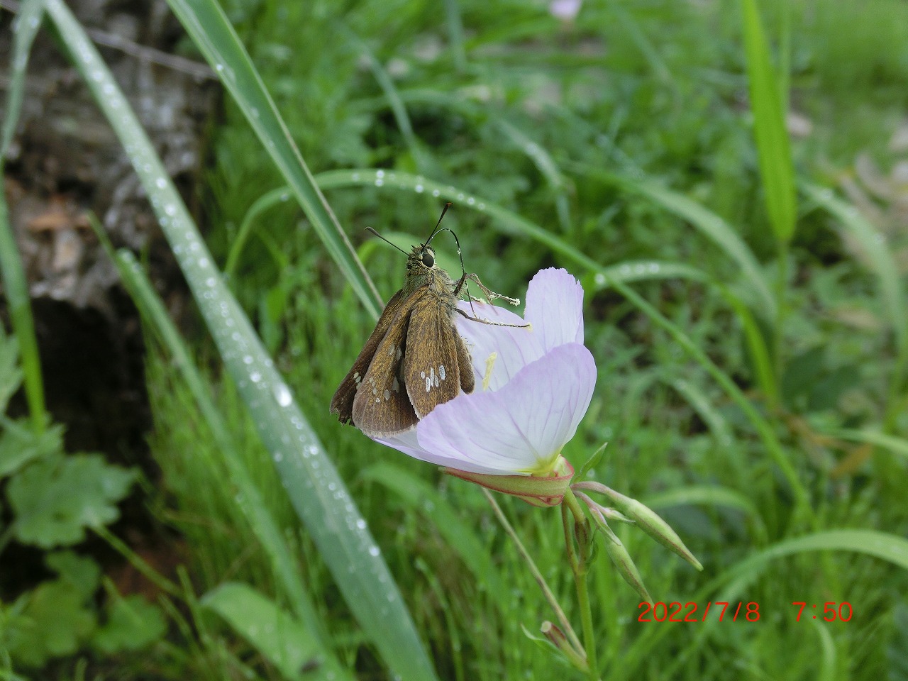 以前にもこの近くでヒルザキツキミソウの花に体ごと入って吸蜜していたオオチャバネセセリを撮っていたことを思い出した。それがこの写真だ。